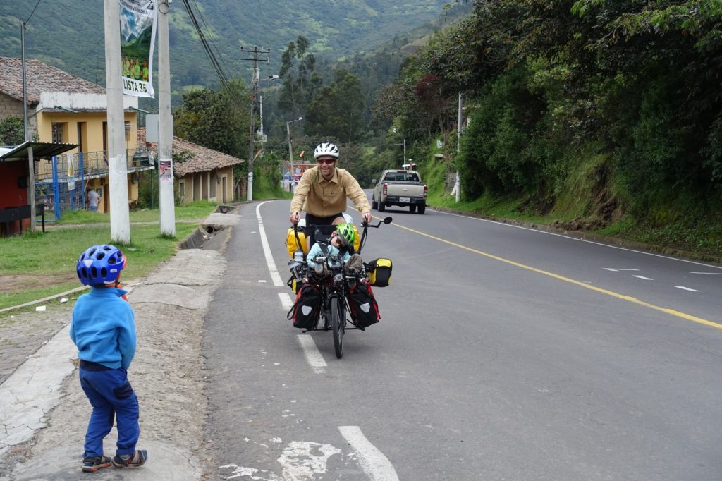 Après le repas, la route est un peu moins difficile. Nous atteignons San Rafael puis Sangolqui. Il est 15h30, nous rejoignons la caserne de pompiers pour demander l’hospitalité (sur les conseils de Santiago). Tout est OK par contre, il nous faut revenir à 18h00. Nous allons donc nous poser dans un parc. Les enfants jouent comme des fous (pourtant, ils ont bien pédalé aujourd’hui). Ils se font des copains. Nous sommes en face d’une école. A la sortie (vers 17h30), nous discutons avec des parents qui attendent.