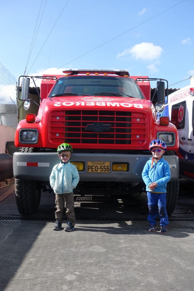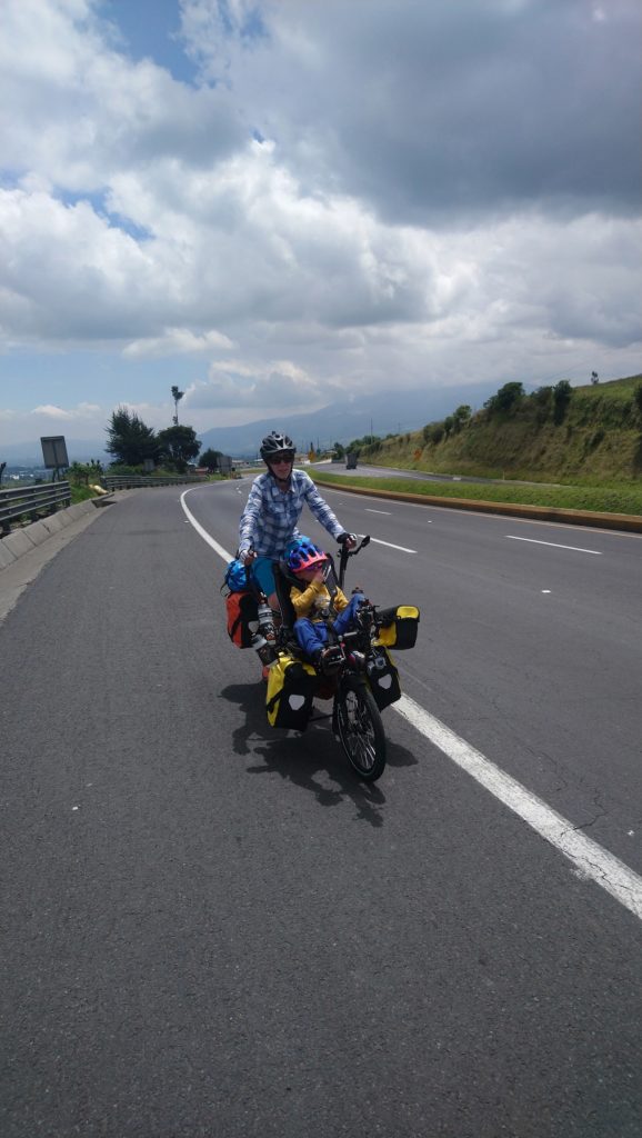 Nous voilà déjà à la sortie pour le parc Cotopaxi. Il se met à pleuvoir, nous couvrons les enfants et c’est parti pour les 4 derniers kilomètres. Et quels kilomètres… Ça monte tranquille et soudain une montée monstrueuse… Plus de 15% ! Avec tout le bardât, c’est passé pour Papa (dans la douleur) mais pas pour Maman. Martin descend, ils poussent le vélo tous les deux. Puis Maman remonte sur le vélo et Martin marche à côté. Ils arrivent enfin à la hauteur de Papa, à l’entrée du parc.