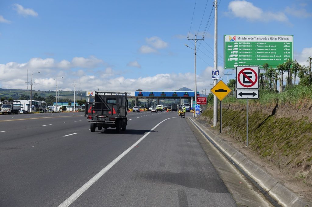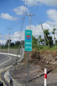 Et nous reprenons notre chère Panaméricaine. Il n’y a pas trop de circulation ce matin, mais ce n’est tout de même pas très agréable. Nous retrouvons Jeff et Olivia. Olivia est à terre et semble blessée. En fait, elle a glissé dans le caniveau en voulant récupérer de l’eau, rien de très grave donc. Nous leur disons à tout à l’heure, car oui, c’est sûr, ils vont nous rattraper ! D’ailleurs nous arrivons au péage et les voilà déjà !