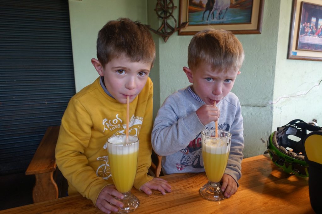 Maman galère vraiment dans une ultime montée, Papa vient l’aider et c’est là qu’elle se rend compte qu’en fait, elle n’avait pas passé le petit plateau ! C’est ça de débrancher le cerveau… Une pause est donc la bienvenue, des bons jus de fruit et des chips de banane, ça fait du bien !