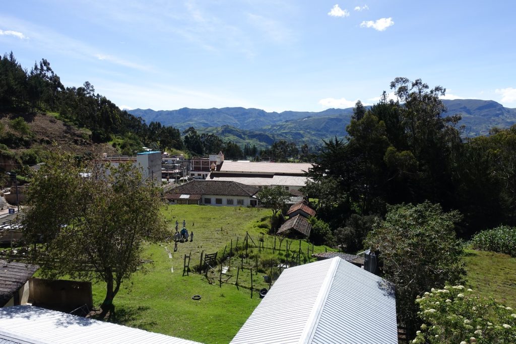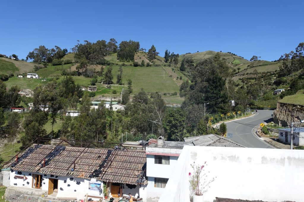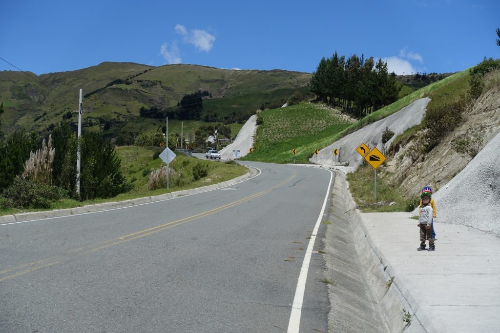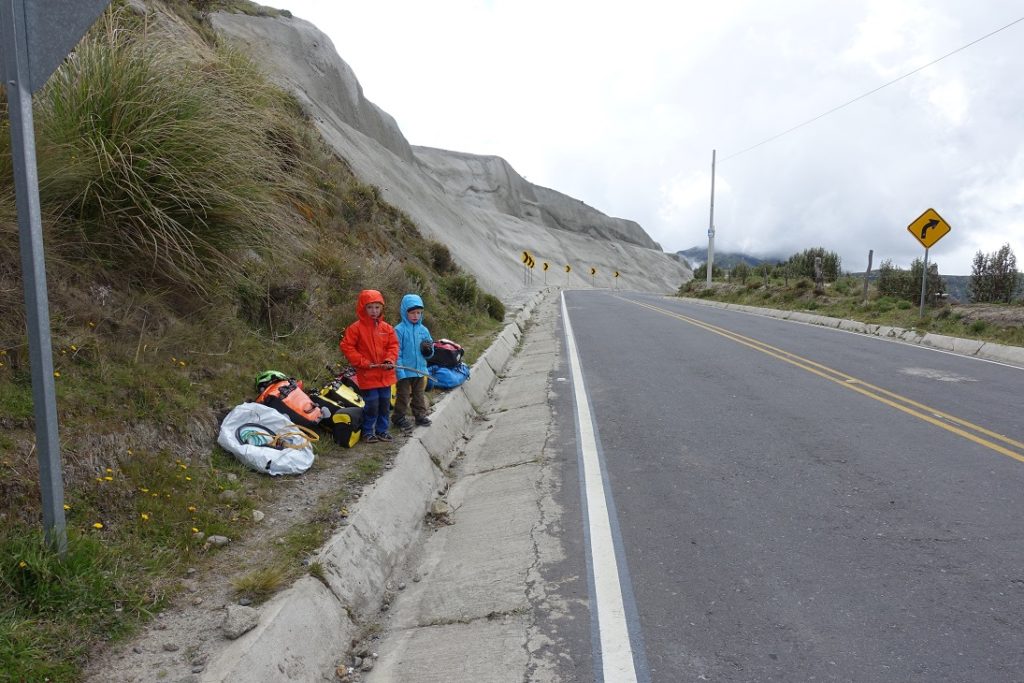 Les enfants descendent. Les parents poussent. Nous sommes rattrapés par le couple de suisses rencontré au parc Cotopaxi. Ils vont aussi à Quilotoa. Nous nous séparons de nouveau. Les enfants fatiguent et commencent à râler. Maman arrête une voiture pour les monter au sommet de la côte. Ils sont déposés au niveau d’une école. Maman leur dit de rester tranquille et retourne aider Papa. Arrivée à sa hauteur, il lui fait gentiment remarquer qu’elle aurait pu embarquer des sacoches… Oups, la boulette… Elle y pensera la prochaine fois ! Après quelques aller-retour, Maman demande à l’école si les enfants peuvent jouer dans la cour, ils seront plus en sécurité qu’au bord de la route.