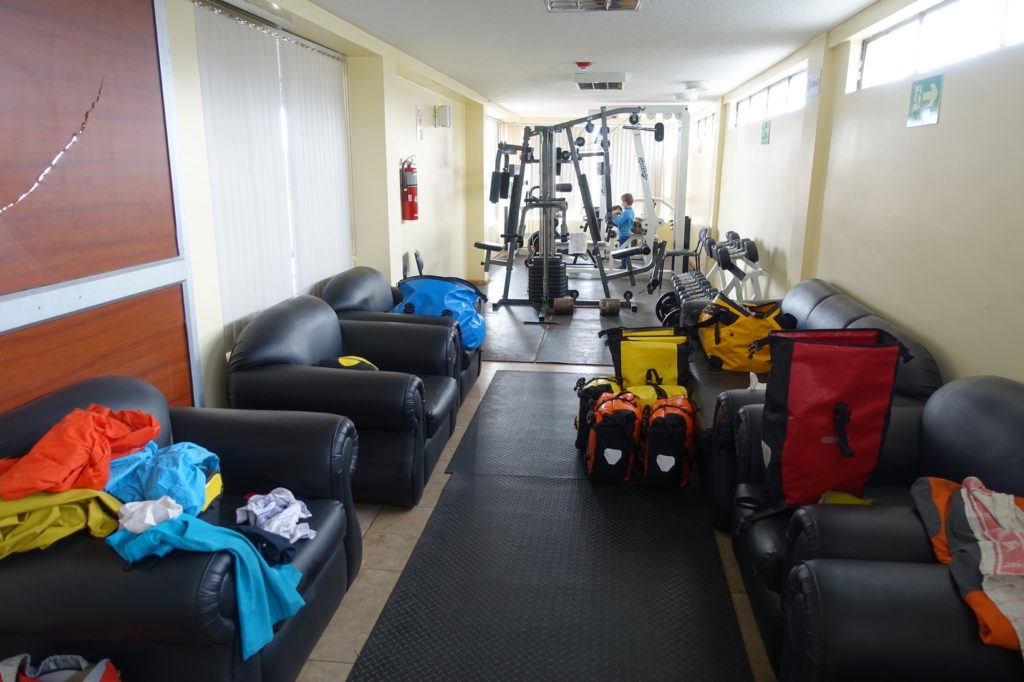 Les parents se sont couchés tard, trop tard… De plus, à 6h00, le réveil des pompiers sonne. C’est une sorte d’alarme avec une personne demandant aux gens de se lever. Pour couronner le tout, il pleut ! Ça ne donne pas envie… Nous prenons le petit-déjeuner dans la cuisine et plions les affaires. Nous disons au revoir et partons en direction de Baños, pour 42 km, finalement sous le soleil.