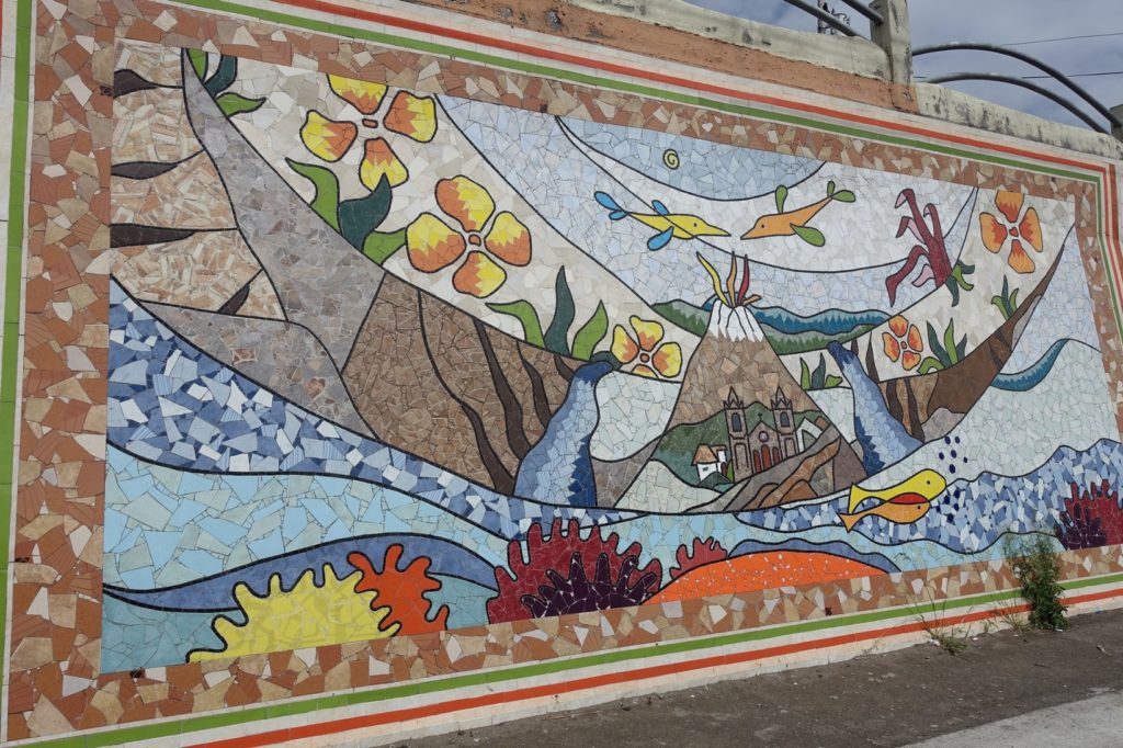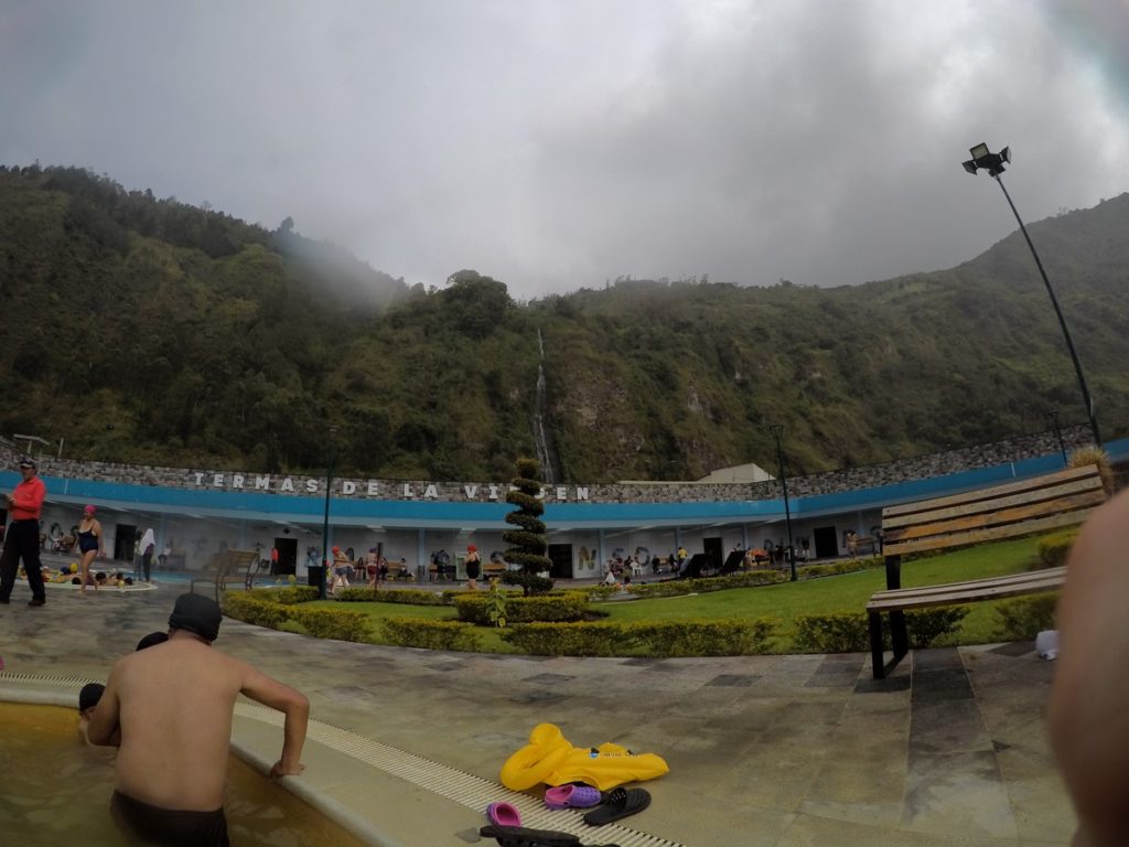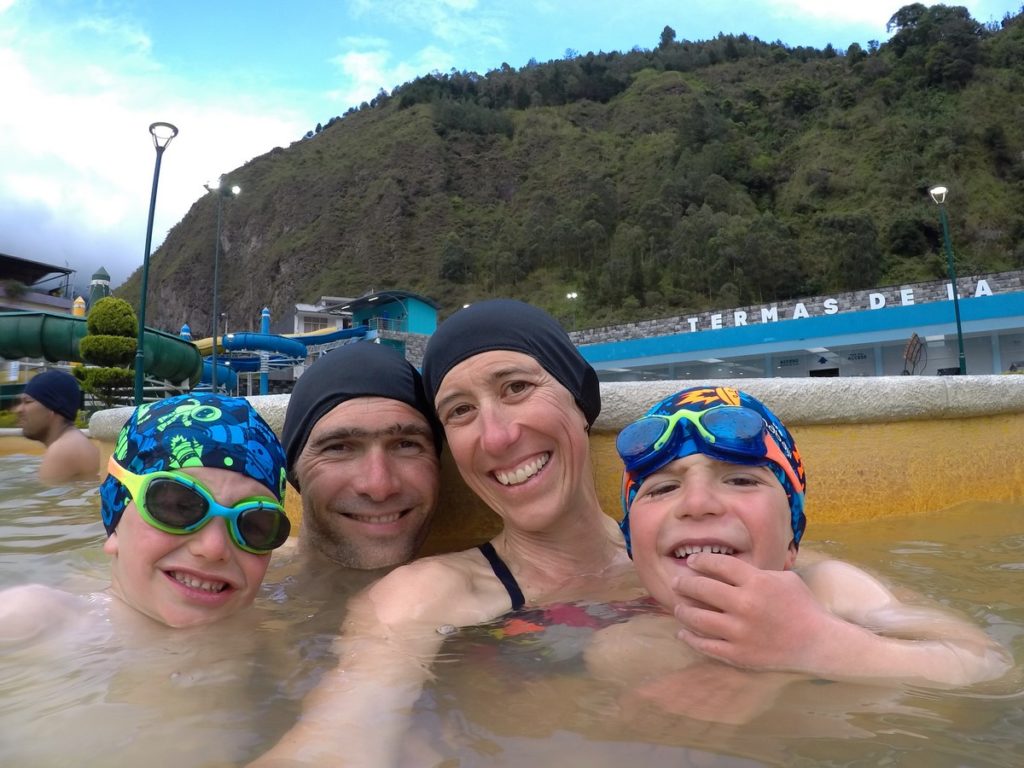 Et nous voilà donc à Baños ! Nous nous installons dans une auberge recommandée par le lonely planet, mettons nos maillots de bain et filons à la piscine. Les prix annoncés par le guide sont complètement faux, c’est bien plus cher mais ça fera plaisir aux enfants. En fait, ce sont des bains chauds et froids, c’est très agréable. En plus, il y a des toboggans. Les enfants sont ravis ! Il y a d’autres jeux pour eux, mais il ne fait pas très chaud hors de l’eau, nous n’en profitons donc pas.