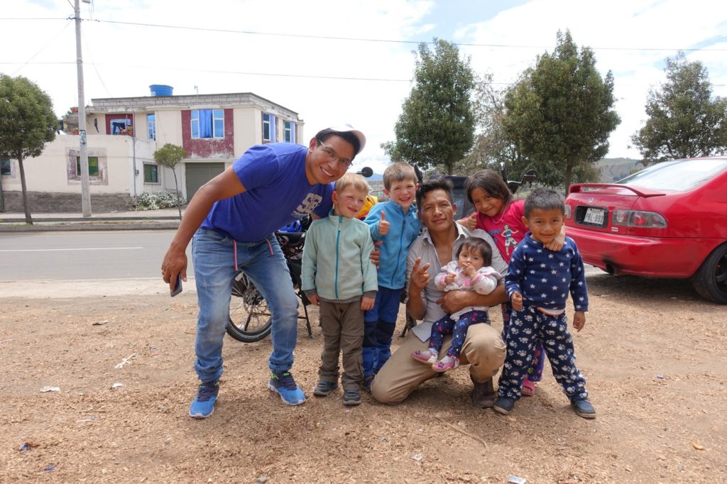 Arrivés à Salasaca, vers 11h00, un groupe nous demande de nous arrêter. Ils veulent nous prendre en photo et nous demandent de manger un morceau avec eux. Il s’agit de Fabian Lagua et sa famille, ils fêtent le baptême d’une de leur petite. Nous profitons donc de poulet et de patates avec du soda et restons un petit moment à discuter.