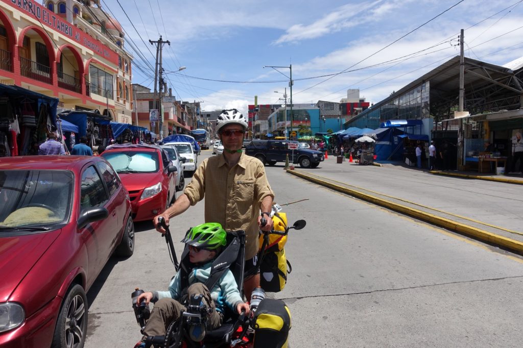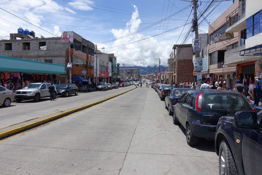 Une longue descente s’amorce. Nous traversons Pelileo et son marché aux jeans. C’est l’effervescence.