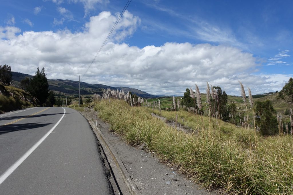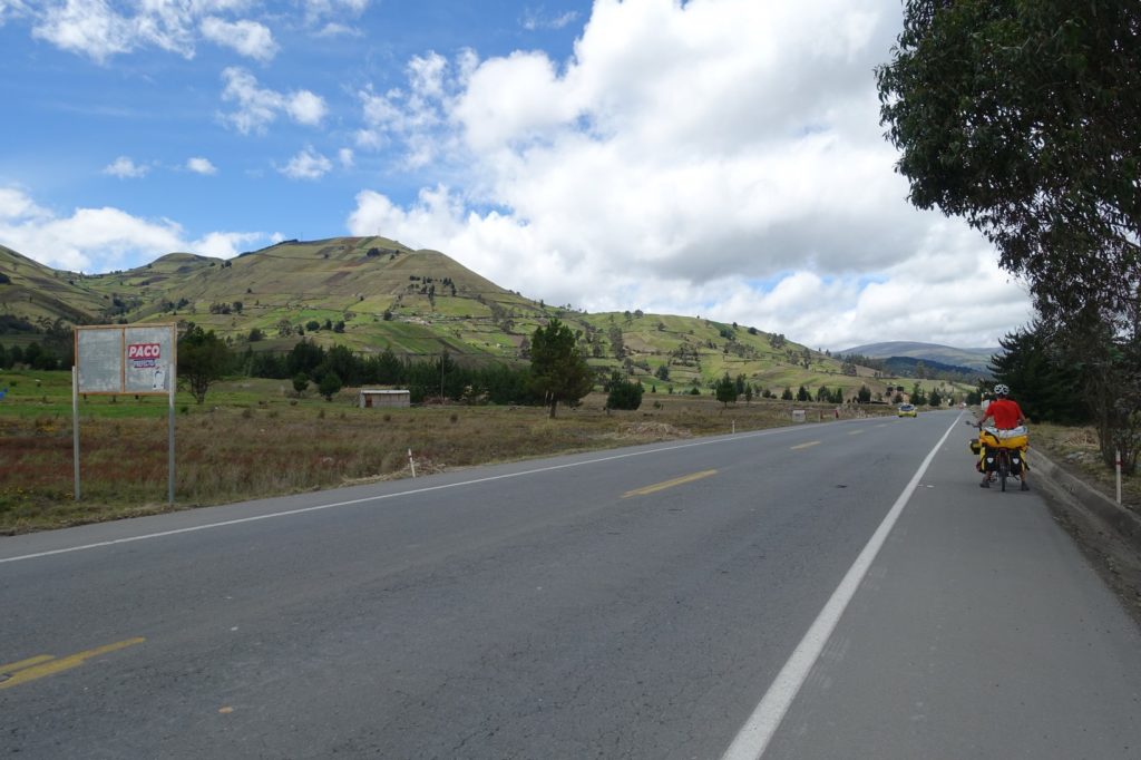 Nous rejoignons la Panaméricaine après quelques courses. Les paysages sont encore une fois splendides ! Au début ça monte assez tranquillement, un pick-up venant en sens inverse s’arrête à notre hauteur. Le conducteur descend de voiture, il nous propose de nous poser chez lui à Cuenca et nous donne sa carte. C’est très gentil de sa part ! Nous irons peut-être chez Myriam et Aurélien, mais passerons quand même les voir. Nous verrons bien ! Nous montons pendant environ 18 km, s’en suit une petite descente puis une section plus raide de 4 km.