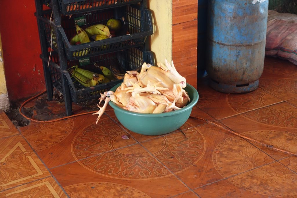 Au sommet de cette côte, nous trouvons un petit village avec quelques restaurants et des poulets rôtis qui n’attendent que nous… La décision est prise ! Nous allons en manger ! On nous propose des abats grillés, très peu pour nous… Il y a aussi des pattes de poulet, comment dire… Nous choisissons plutôt des bons petits morceaux ! Il est bien croustillant et la sauce des frites est excellente ! Nous nous régalons ! En dessert, nous achetons du gâteau. Voilà un bon repas et tout ça pour 3$50 ! Au moment de partir, Martin fait un gros câlin à la cuisinière, elle nous offre en plus un autre lot de gâteaux !