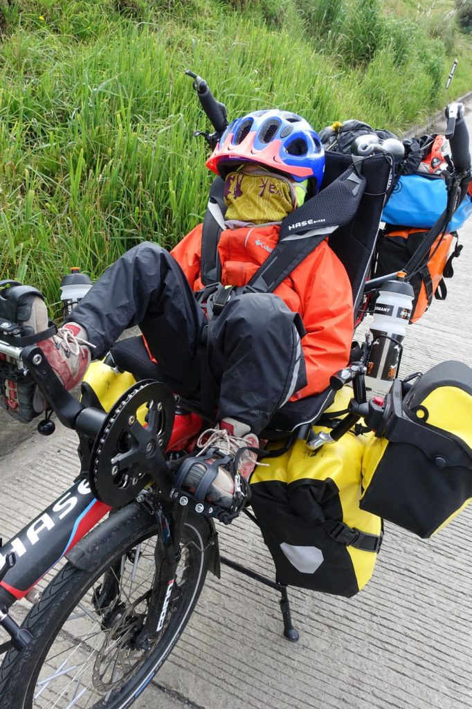 Tout commence par une petite descente de 4km, il y a du vent, il ne fait pas très chaud. Ensuite nous enchaînons sur la difficulté de la journée, 15km de montée, avec bien sûr, le vent de face la plupart du temps… Nous sommes interpellés par un homme en pick-up, il nous pose quelques questions et voulait que sa fille voit nos vélos. Il fait beaucoup de VTT, et rêve de partir voyager en vélo !
