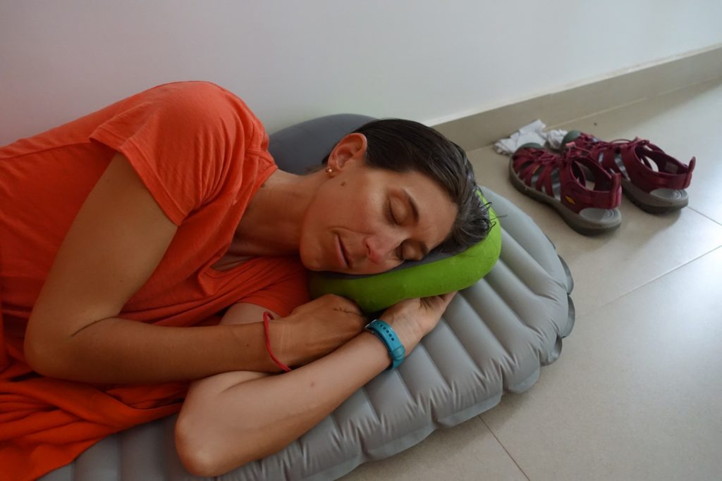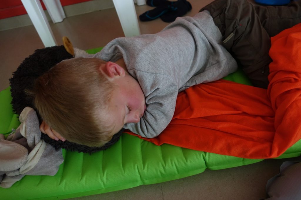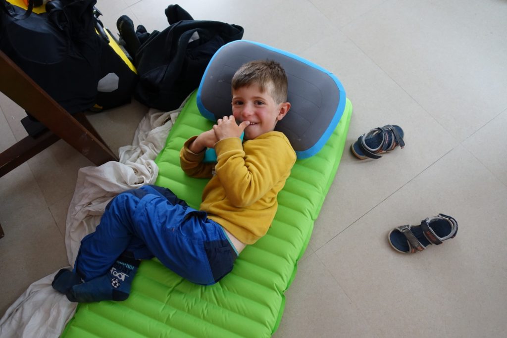 Nous ne parvenons pas à manger le midi. Nous alternons sieste et réveil. Les enfants sont sages, ils écoutent la fabrique à histoires. Nous nous reposons. Espérons que ça aille mieux demain, la journée doit être difficile, une montée de 10 km pour faire plus de 1100m de dénivelé. Il faut que nous soyons en forme !