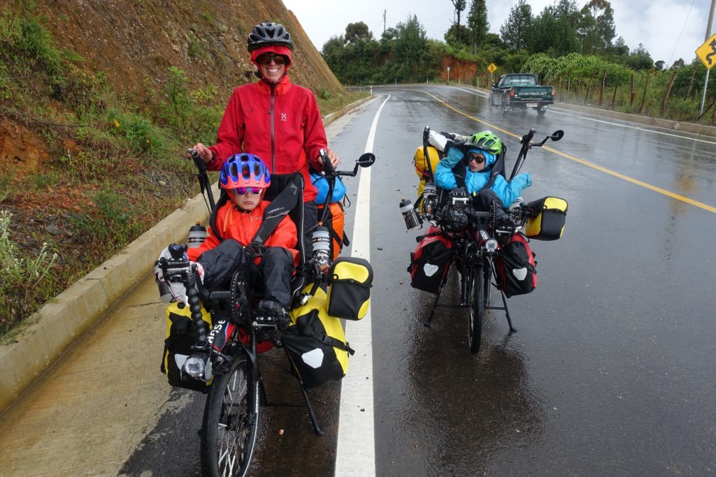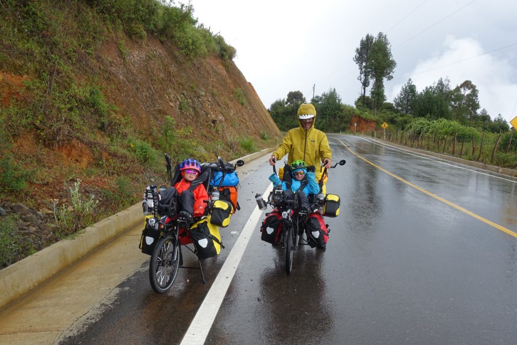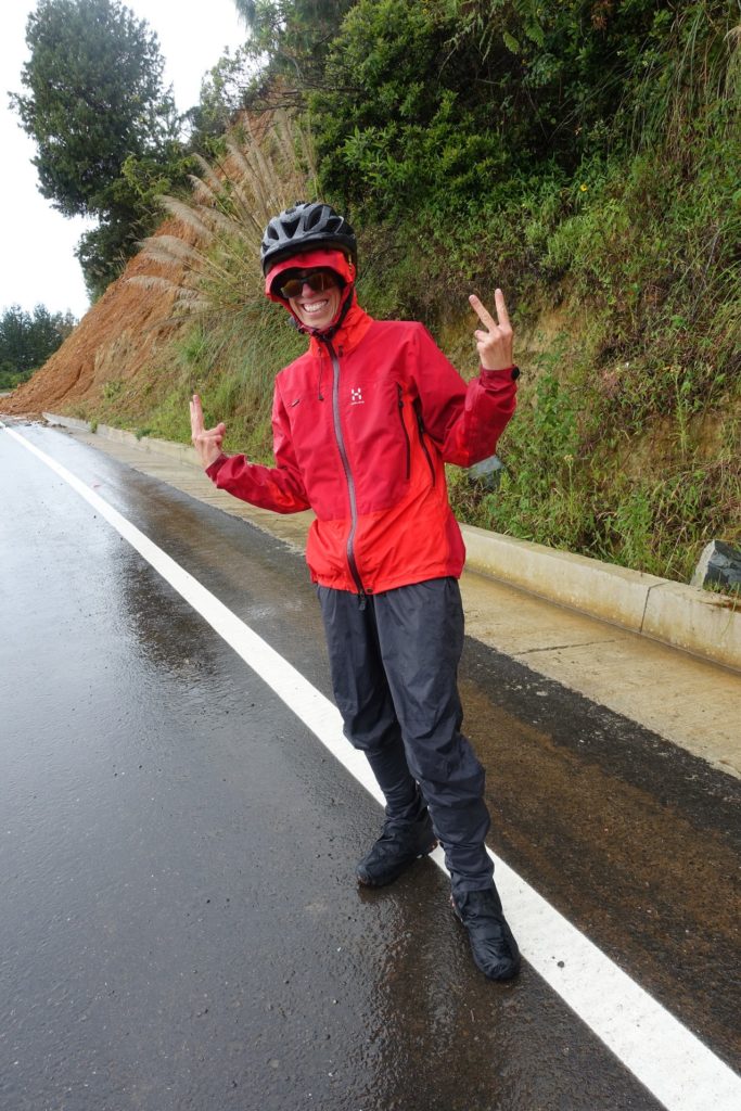 Les derniers kilomètres et voilà la descente… et la pluie ! Nous nous mettons à l’abri d’une maison et patientons un petit moment. Mais pas de chance, ce coup-ci ça ne s’arrête pas. Nous nous habillons pour l’occasion et partons sous la pluie. Il pleut par intermittence au début puis en continu avec du brouillard par moment. Il y a de nombreux éboulements tout le long, il nous faut être prudents. Les deux compteurs sont en rade. Ils n’aiment définitivement pas l’eau ! Nous trouvons ça bizarre tout de même ! Et ça nous agace !