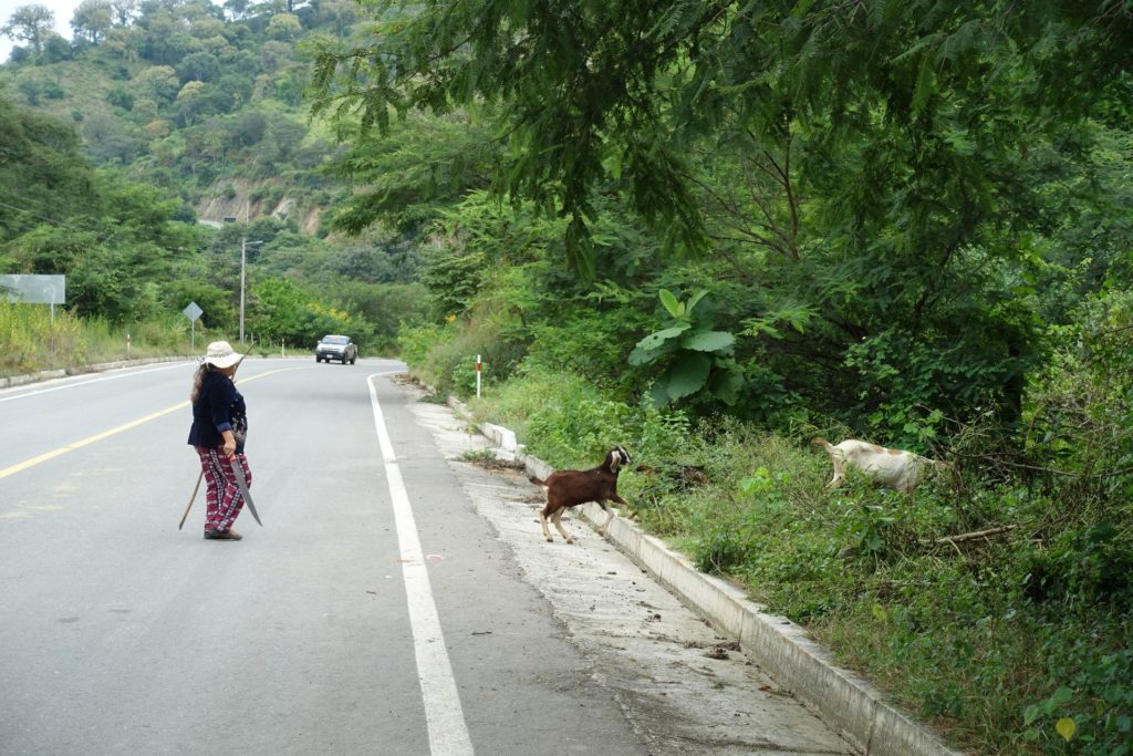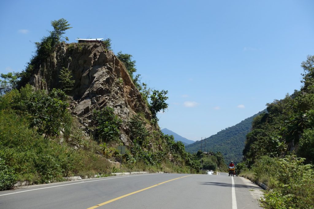 Quasiment toute la descente se fera dans le brouillard. Nous n’y voyons pas grand chose. Nous sommes obligés de nous arrêter pour passer un éboulement encore à l’état boueux. D’ailleurs Maman refait tomber le vélo en glissant, à l’arrêt cette fois. En bas, nous découvrons une petite vallée. La route descend mais est ponctuée de montées bien pentues. Les jambes sont douloureuses ! Des vaches sont sur notre chemin, puis ce sont des chèvres qui traversent la route.