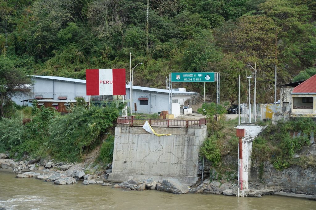 39,5 km depuis ce matin et nous passons la frontière ! Nous obtenons notre tampon de sortie côté équatorien puis traversons le pont pour les formalités d’entrée. Nous sommes déçus, le panneau « Bienvenue au Pérou » est très loin, toujours sur l’ancien pont frontalier, nous ne pourrons pas faire de belles photos… Nous tentons de demander 180 jours au lieu des 90 de base, mais rien à faire. Le douanier ne veut rien entendre. Il nous montre un papier disant 90. Bon, tant pis… Il faudra surveiller pour renouveler moyennant finance si besoin…