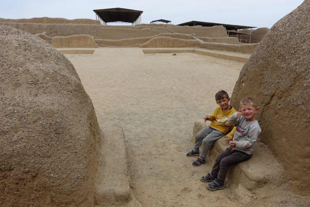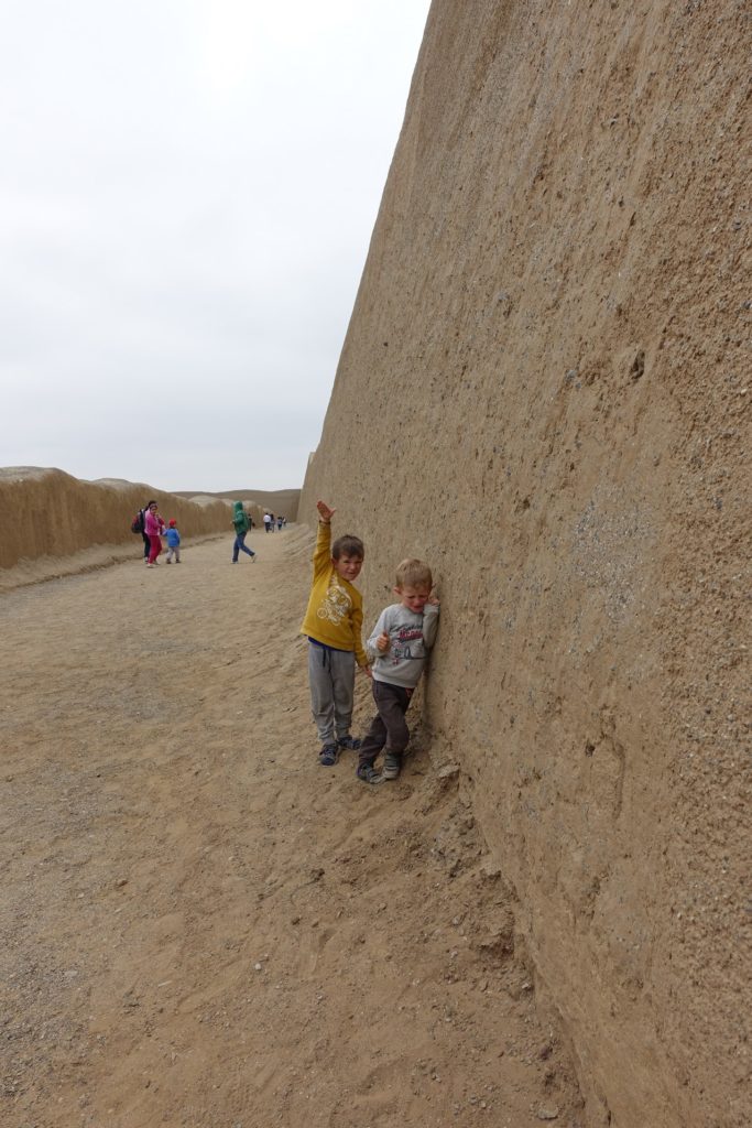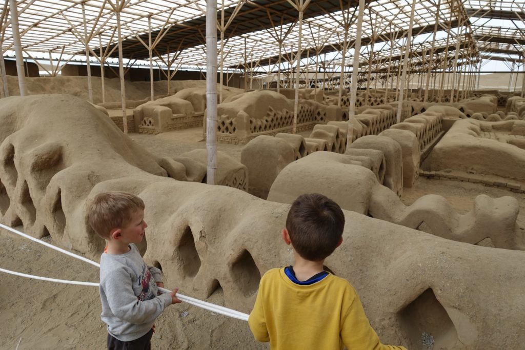 Nous faisons une petite balade dans les ruines. Il s’agit de la plus grande ville en adobe de l’empire Chimú. Seul le palais Tschudi se visite. Les enfants sont contents de parcourir ses dédales et admirent ses frises.