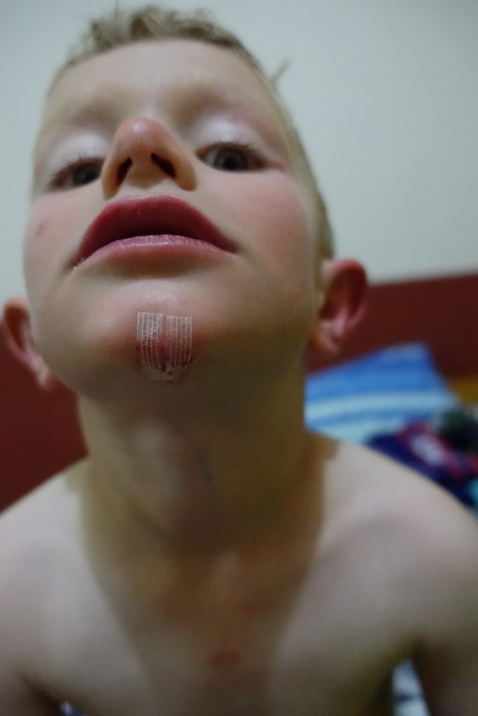 Ça toque à la porte, nous entendons Lucas pleurer. Aïe ! Il s’est ouvert le menton soit disant en tombant sur le carrelage. Il ne s’est pas raté ! Si ça continue, il va revenir complètement défiguré !