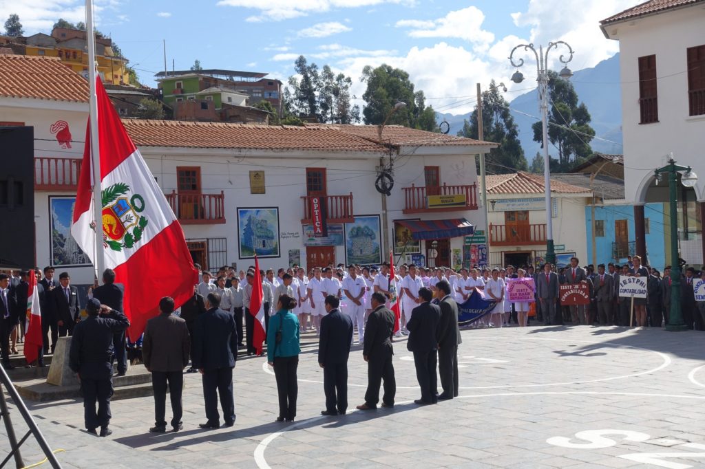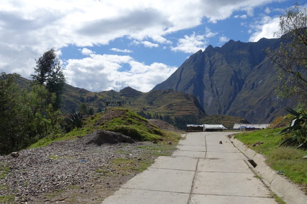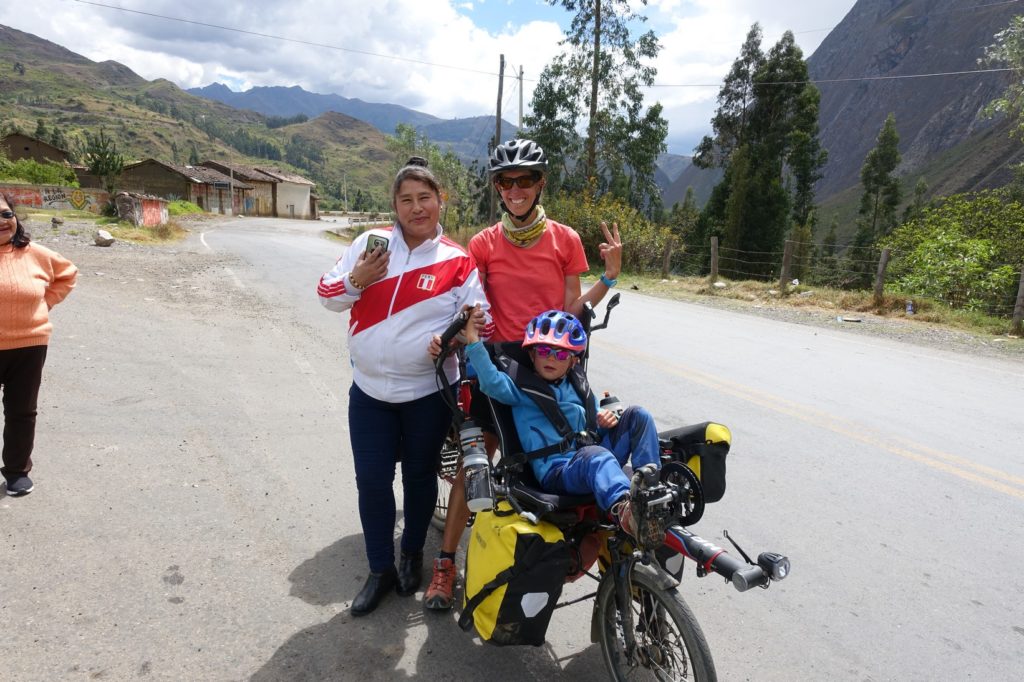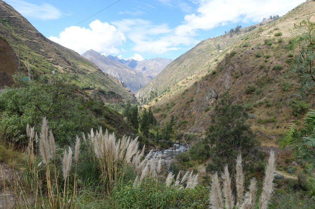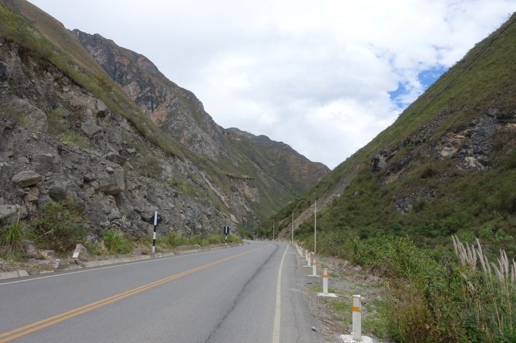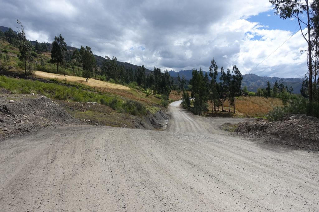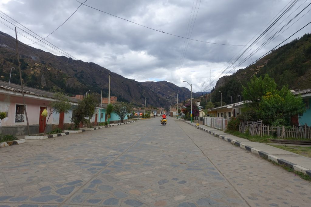 S’en suit la montée jusque Chavín, nous sommes dans un canyon. Par moment, la route n’est plus asphaltée, forcément, c’est quand la pente est la plus raide. Mais ça ne dure jamais longtemps. Nous sommes arrêtés par des gens qui veulent nous prendre en photo. Sur le bord de la route, nous voyons souvent du bois coupé. Il y a sûrement eu des fêtes ici aussi.