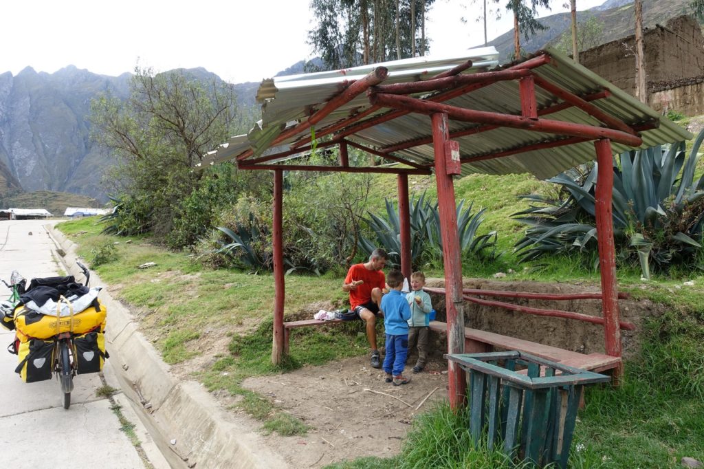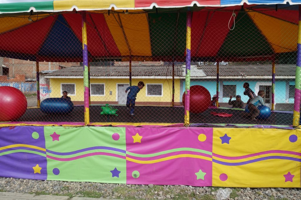 Puis nous voilà à Chavín, nous prenons un rue pavée et arrivons à une place avec des jeux pour enfants. Cette fois, nous offrons aux enfants un tour de trampoline. Vus les derniers jours, ils l’ont bien mérité !