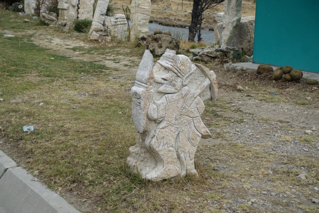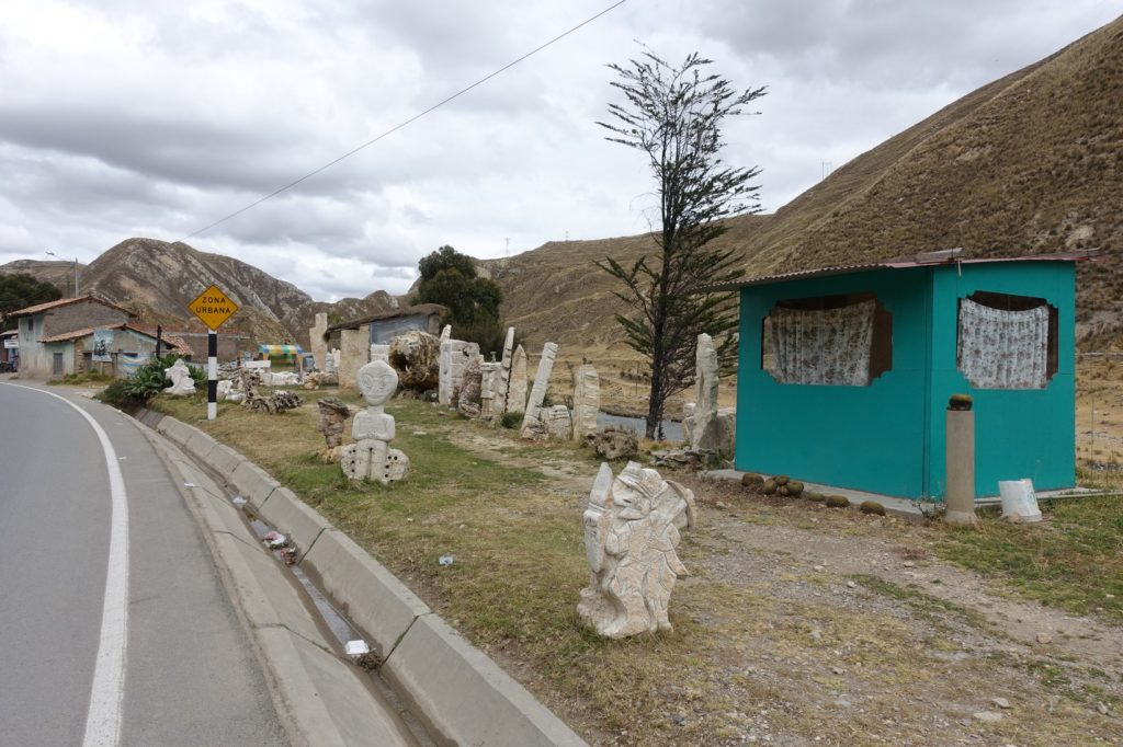 Nous nous remettons en route. Globalement, la route descend mais il y a tout de même des petites côtes. Nous sommes obligés de pédaler tout le temps. Nous passons devant un tailleur de pierres. Un peu après, en levant la tête, nous apercevons des puya raimondii. Que font-elles ici ?