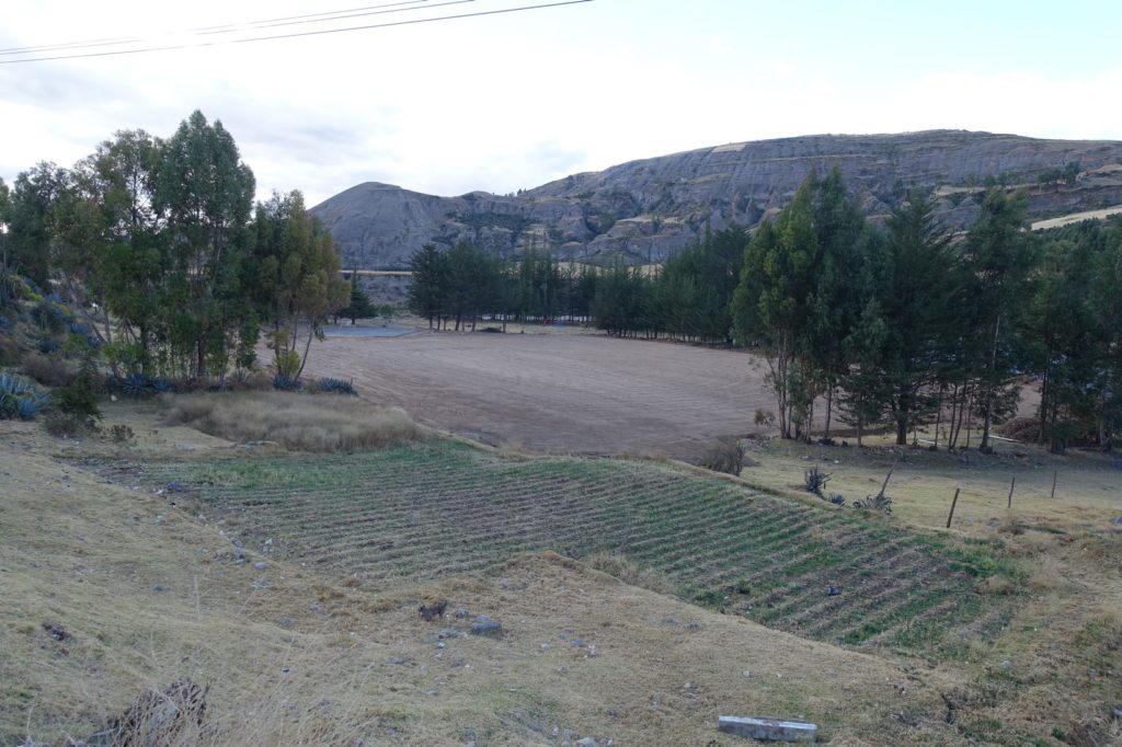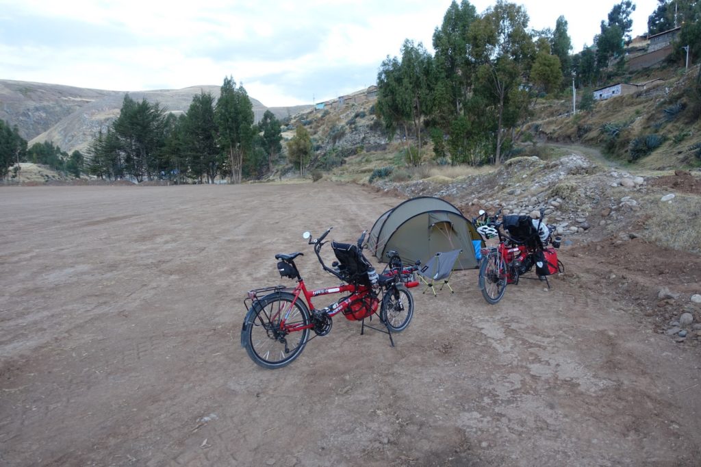 Nous avançons bien en direction de Jauja, mais ce soir, nous voudrions bivouaquer. Nous prenons un petit goûter devant un terrain de football, mais il est encore tôt, nous allons continuer. En chemin, il y a quelques terrains plats mais beaucoup de déchets, nous passons donc notre chemin. C’est au village suivant que nous trouvons notre bonheur. Un terrain en contrebas avec des jeux pour les enfants. Papa va voir une personne qui y est avec ses enfants, pas de soucis, nous pouvons camper. Nous poussons donc la barrière et descendons nous installer.
