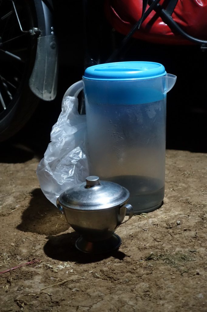 Sonia revient avec une grosse carafe d’eau à la cannelle, du sucre et deux mugs. Elle nous raconte que d’autres gens sont venus dormir ici mais en voiture. Elle a vu de la lumière le soir vers 20h, inquiète, elle a rameuté les villageois. Ils sont descendus à huit voir qui c’était 😀 Pour nous, elle nous dit que ce sont ses enfants qui l’ont prévenue : « il y a des gringos qui campent en-dessous ». Voyant que Lucas adore le maïs et que nous avons presque tout terminé, elle nous dit qu’elle nous en refera demain pour le voyage. Elle est vraiment gentille ! Nous sommes vraiment gâtés une fois de plus.
