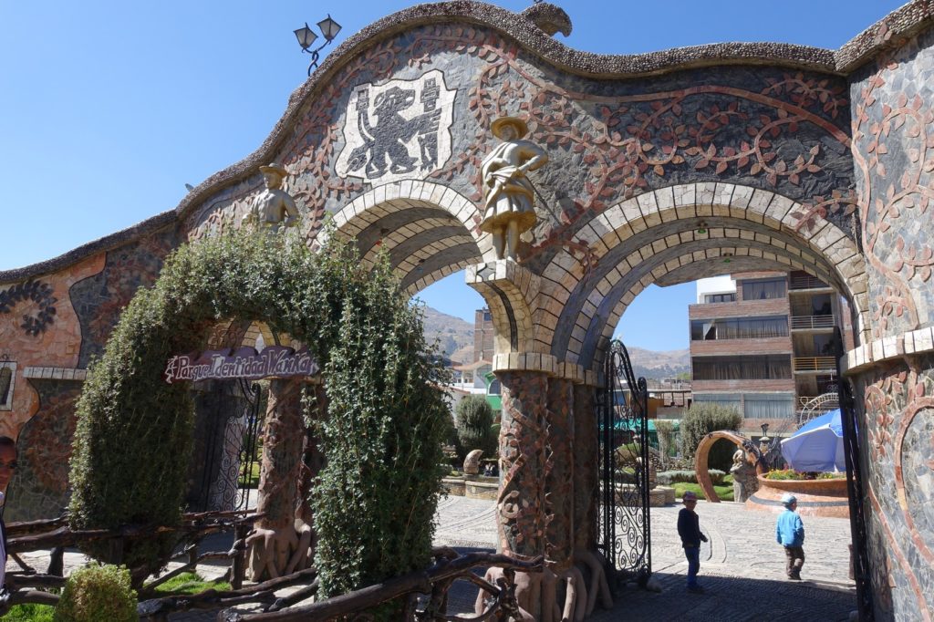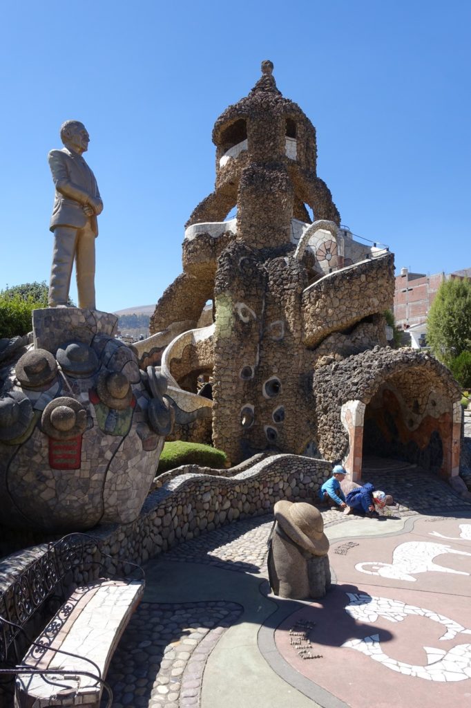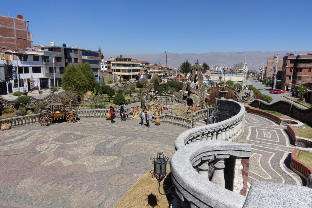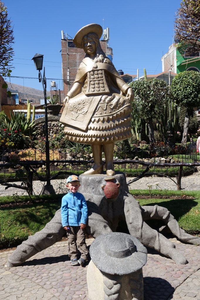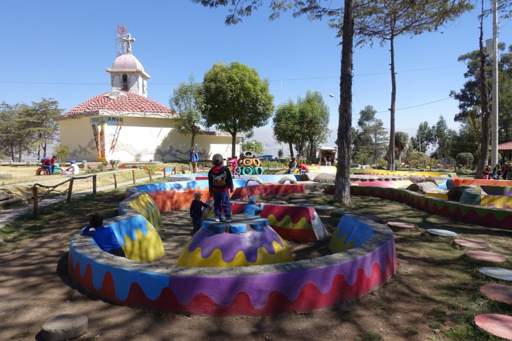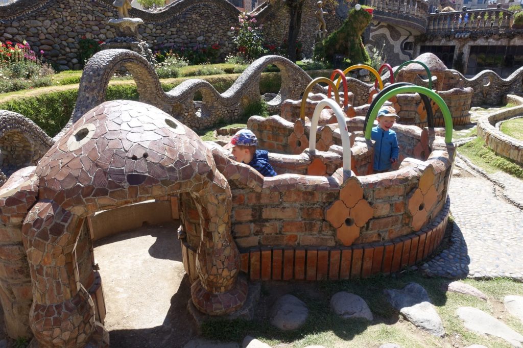 Il fait froid dans la maison alors qu’il y a un grand soleil dehors. Nous sortons donc pour faire un tour au parc de la Identidad Huanca. Il est à 1 km, nous y allons à pied. Nous ne sommes pas déçus ! Il est quasiment tout en pierres, avec des statues. Dommage que toutes les fontaines soient éteintes. Les enfants jouent avec leurs voitures, ils peuvent même monter dans une tour. Papa n’est pas au top de sa forme, il est mieux là que sur Satanas…