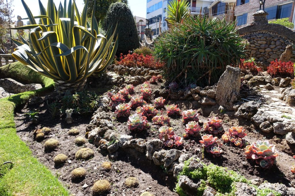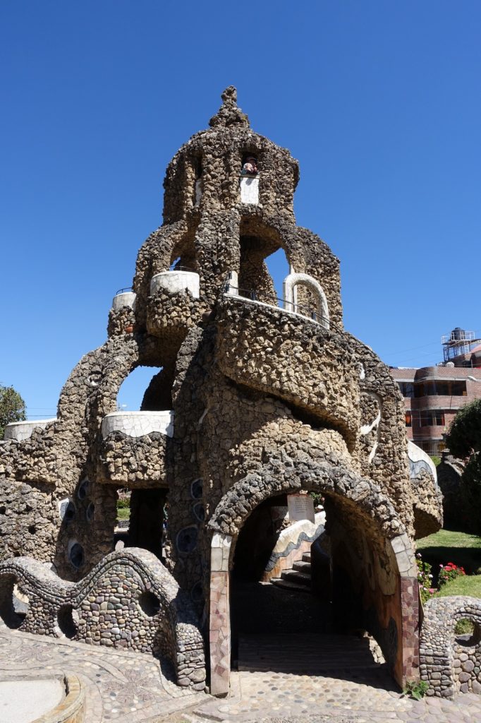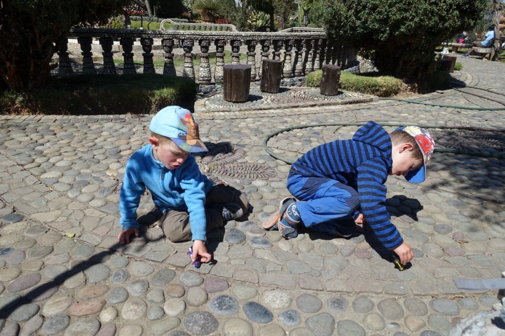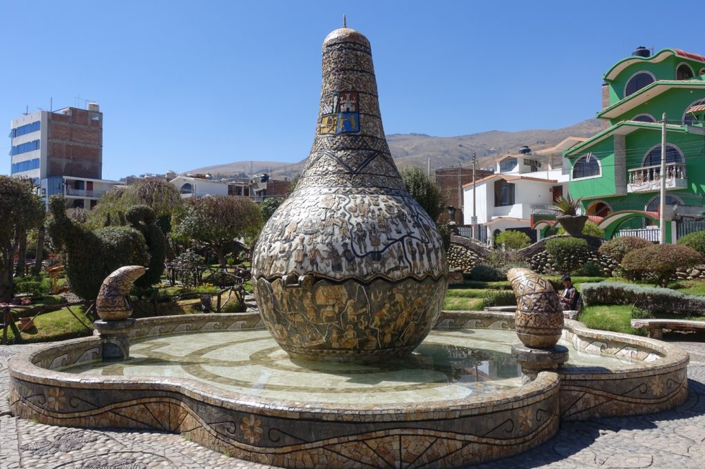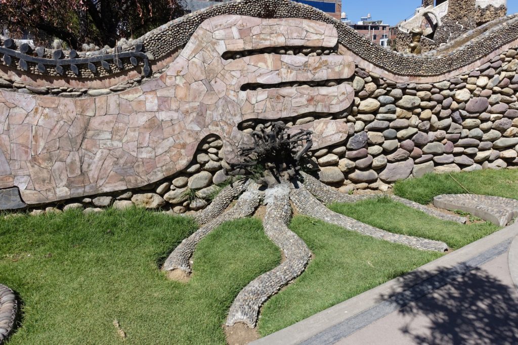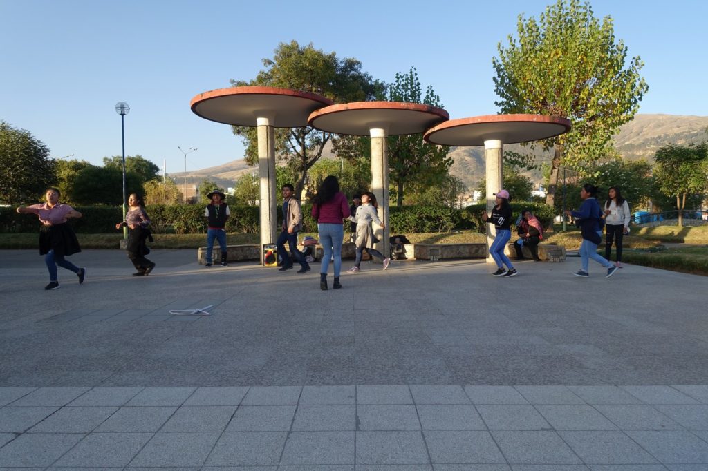 Il fait froid dans la maison alors qu’il y a un grand soleil dehors. Nous sortons donc pour faire un tour au parc de la Identidad Huanca. Il est à 1 km, nous y allons à pied. Nous ne sommes pas déçus ! Il est quasiment tout en pierres, avec des statues. Dommage que toutes les fontaines soient éteintes. Les enfants jouent avec leurs voitures, ils peuvent même monter dans une tour. Papa n’est pas au top de sa forme, il est mieux là que sur Satanas…