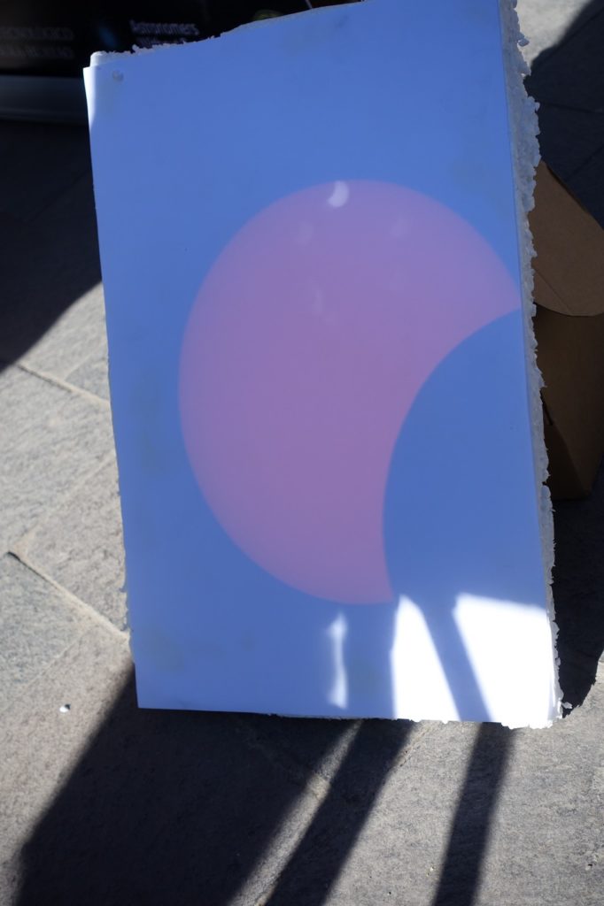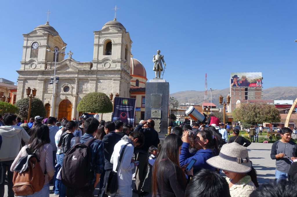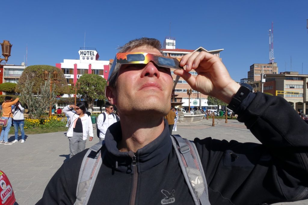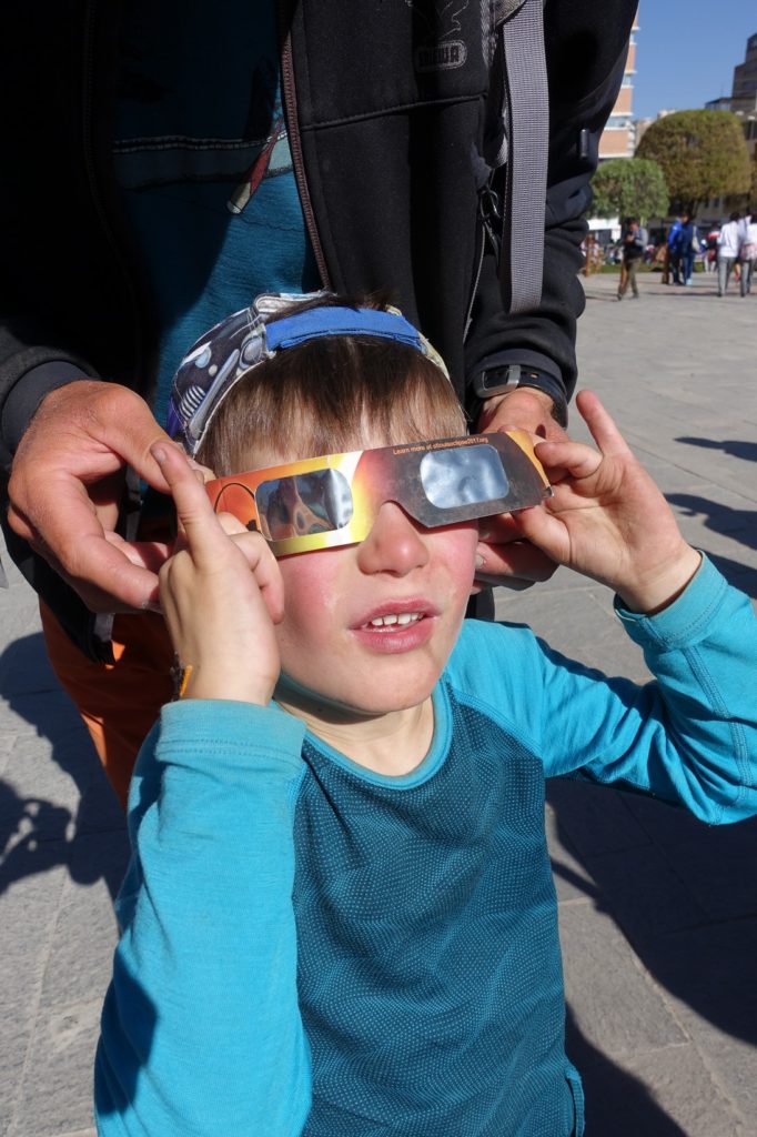 Pour la suite, nous nous posons un peu sur la place. Les enfants jouent avec leurs voitures. Nous voyons des gens installer des télescopes. Nous ne comprenons pas trop puis nous voyons une de leur affiche. Il va y avoir une éclipse partielle de soleil. Nous allons pouvoir la voir ! Génial. Maman se met dans la queue pour profiter du télescope. Ils prêtent des lunettes mais il faut donner ses papiers d’identité en échange. Nous n’avons rien sur nous. Maman demande quand même, la jeune fille n’est pas très chaude et lui dit de voir avec le responsable. Dans la file, les gens lui disent : « c’est une touriste, il faut lui prêter une paire ! ». C’est finalement un jeune homme qui donne sa carte d’identité et prête la paire à Maman. C’est vraiment gentil de sa part. Les enfants et les parents peuvent voir l’éclipse qui a commencé. Au Chili, ils pourront voir une éclipse totale ! Ça y est, c’est notre tour. Les enfants essayent de regarder mais ne voient pas grand chose. Nous sommes même interviewés 😀