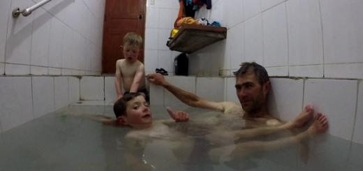 L’école est fermée, en fait, c’est el dia del profesor, il n’y a pas cours aujourd’hui. Sur la place, il y a un petit terrain de foot, nous demandons à la mairie pour nous installer, il n’y a aucun problème. Nous sommes encerclés d’enfants nous posant des questions. Papa récupère de l’eau à la mairie pour la filtrer, il est bien entouré ! Nous montons ensuite la tente, tous les enfants s’extasient ! Nous entendons des grands waouh. Ils rentrent et regardent, touchent à tout. Ils nous demandent où nous allons dormir s’il pleut 🙂 Une fois la tente montée, Maman leur fait faire des tours de vélo. Puis Papa leur montre comment fonctionne le réchaud. Deux d’entre eux restent même avec nous pendant que nous mangeons. Nous devrions tous les revoir demain matin. C’est dommage, Martin n’a pas la forme ce soir, il va directement se coucher.