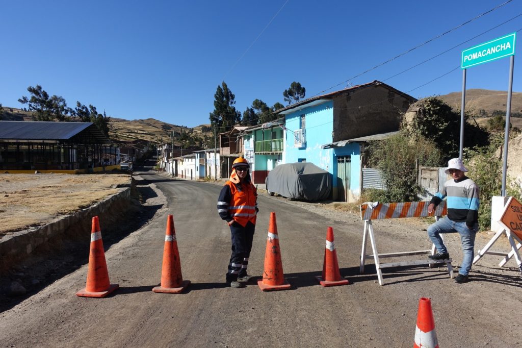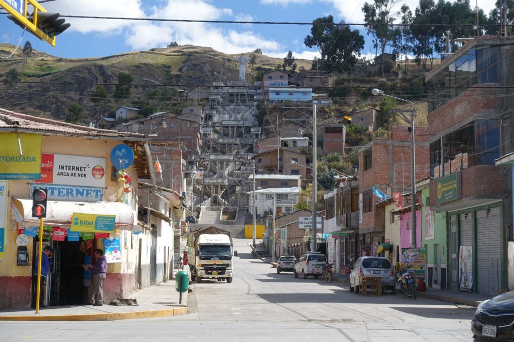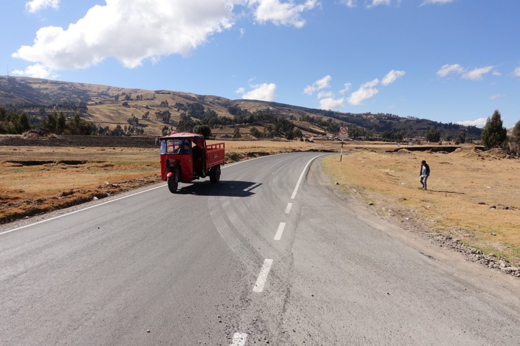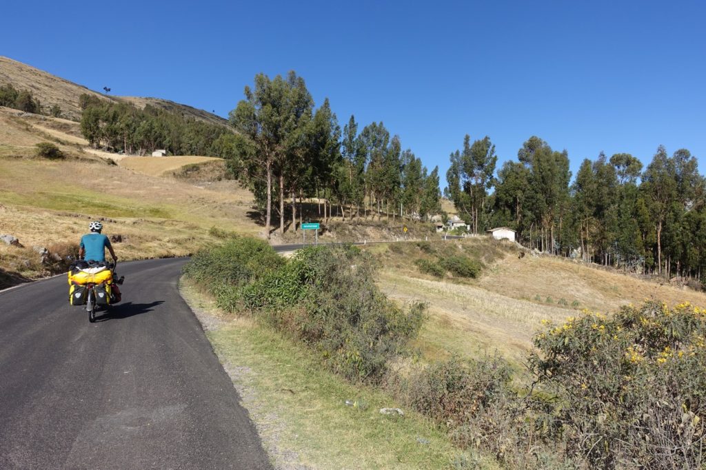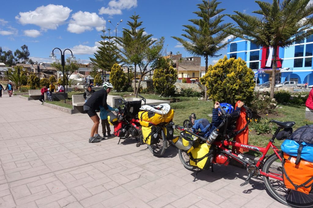 Nous faisons notre pause déjeuner à Acobamba, sur la place. Un homme nous accoste, il s’agit de Benedicto, il semble un peu saoul. Il nous raconte qu’il n’y a pas souvent des touristes par ici, il nous rapporte des jus de pêche et des biscuits. Puis il nous demande de lui écrire un petit mot pour avoir un souvenir de nous. Juste avant de partir, nous rencontrons un français installé à Tarma depuis 8 ans. Nous discutons un peu puis nous remettons en route.