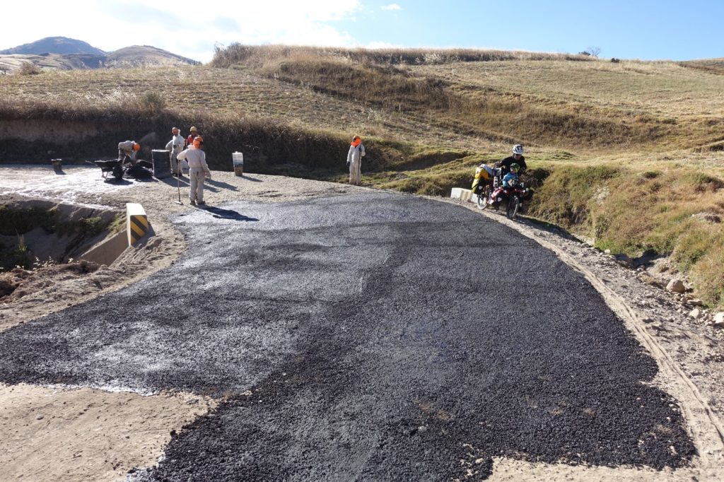Nous arrivons dans un village. La route est fermée, décidément ! L’ouvrière nous dit qu’elle ouvre à 18h00, c’est dans trois heures ! Nous essayons de négocier pour passer quand même. Elle appelle son patron et finit par nous laisser avancer. En fait, beaucoup plus loin, des hommes goudronnent des petits bouts de route. Nous passons à pied au bord. Heureusement que nous avons pu avancer, nous sommes presque arrivés à destination.