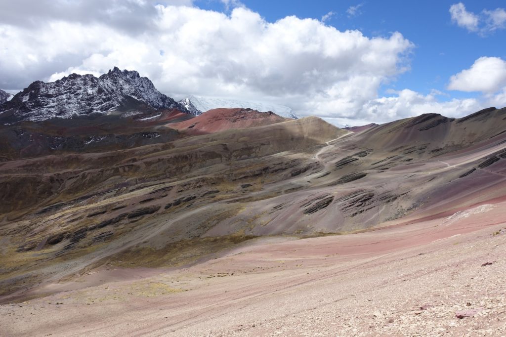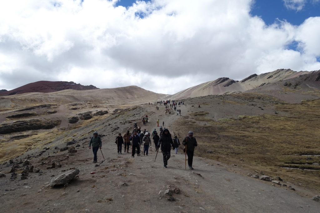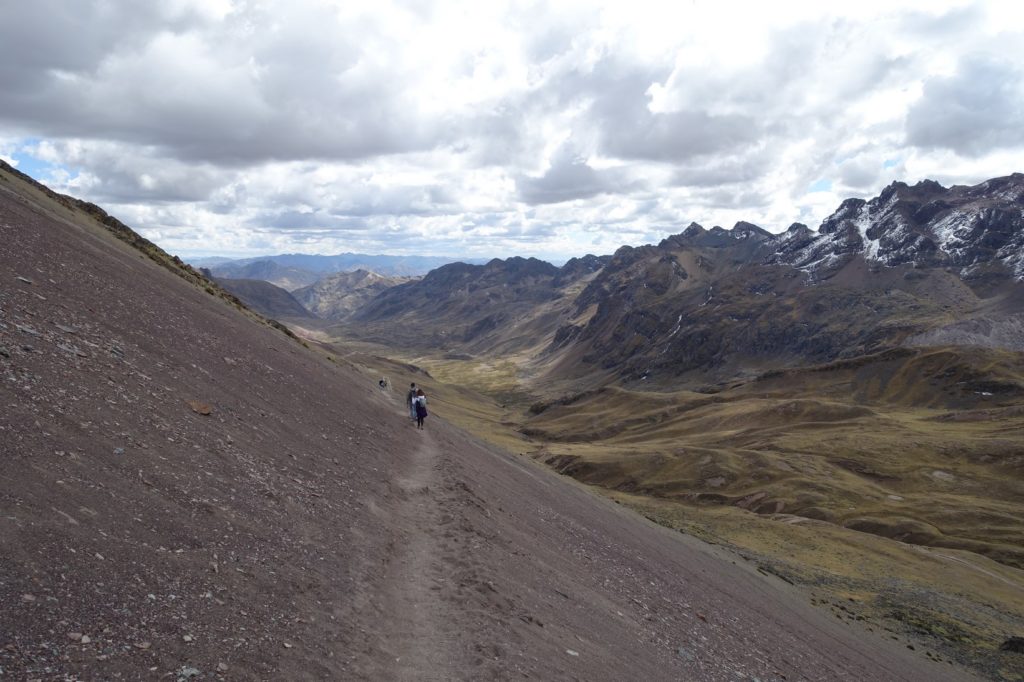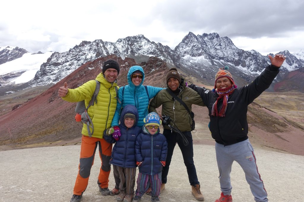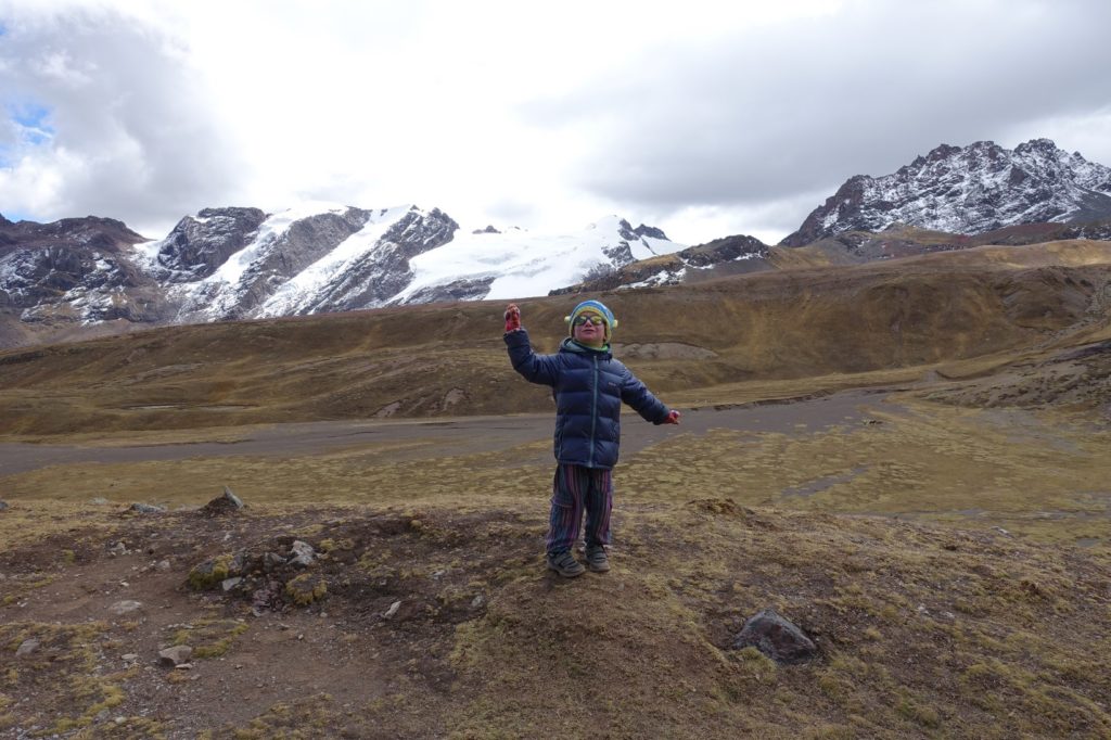 Nous atteignons le mirador au col. Il y a déjà beaucoup moins de monde que ce matin. La plupart s’arrête ici au lieu de parcourir la faible distance jusque Winikunka à 5036 m d’altitude. Nous montons, c’est un nouveau record d’altitude pour toute la famille ! De là-haut, nous avons une superbe vue, que ce soit sur la montagne aux 7 couleurs ou sur l’Ausangate. Par contre, il fait très froid ! Par moment, il y a de grosses rafales de vent. Nous partageons un Sublime et redescendons.