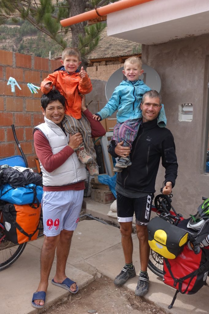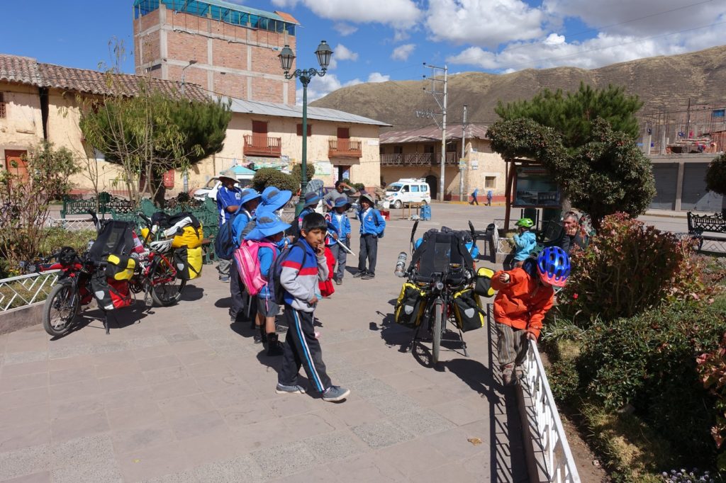Nous nous disons au revoir puis partons en quête d’une place ou autre pour prendre notre déjeuner. Nous nous posons finalement à San Pedro, sur la plaza de Armas. Très rapidement, les enfants viennent voir nos vélos et nous discutons un peu avec des adultes qui passent par là.