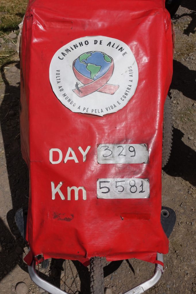 Nous repartons pour trouver un endroit pour manger. Nous hésitons à rentrer dans San Pedro mais continuons tout droit. Au loin, nous voyons 3 personnes marcher. On dirait que l’une d’elle est un marchand de glace avec un chariot. Quand nous arrivons à leur hauteur, nous entendons un « c’est les français ! ». En fait, il s’agit de Marcelo, Kadu et Raoul. Marcelo est brésilien, suite au décès de sa soeur à cause du VIH, il a décidé de parcourir le monde à pied pendant 10 ans. Kadu, brésilien lui aussi, lui tient compagnie pendant 1 mois et Raoul, péruvien, les accompagne pour la journée. Ils sont vraiment sympas, nous discutons un bon moment avec eux. Marcelo parle français. Il a appris la langue durant son séjour de 4 ans en France pour ses études. Nous apprenons qu’Omar lui a parlé de nous (de la même manière qu’il nous avait parlé de lui). Il doit passer chez lui dans les prochains jours.