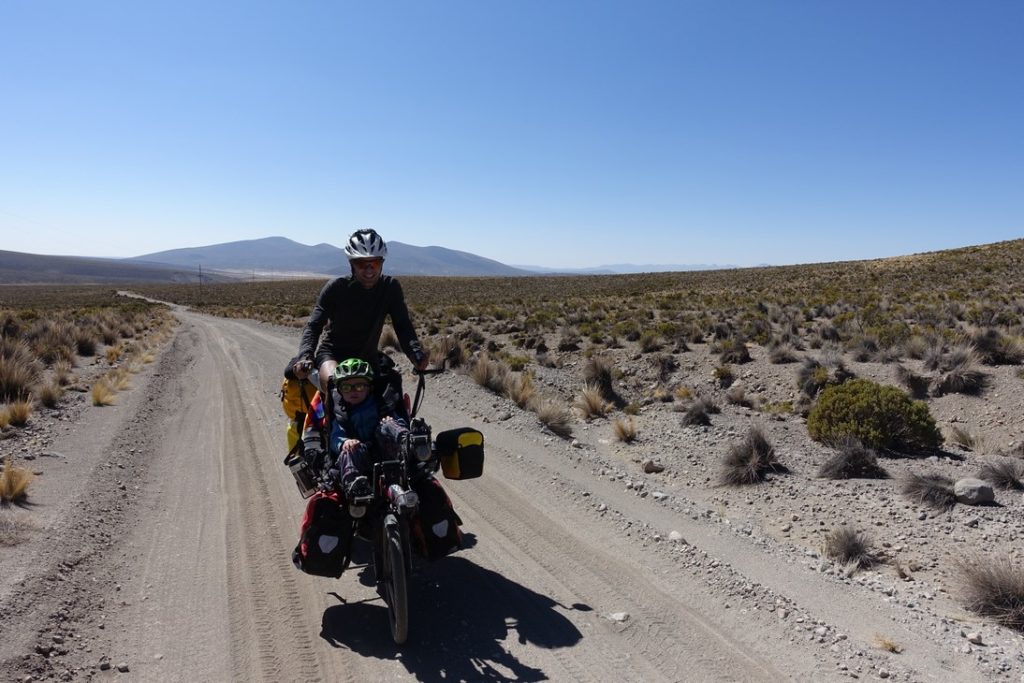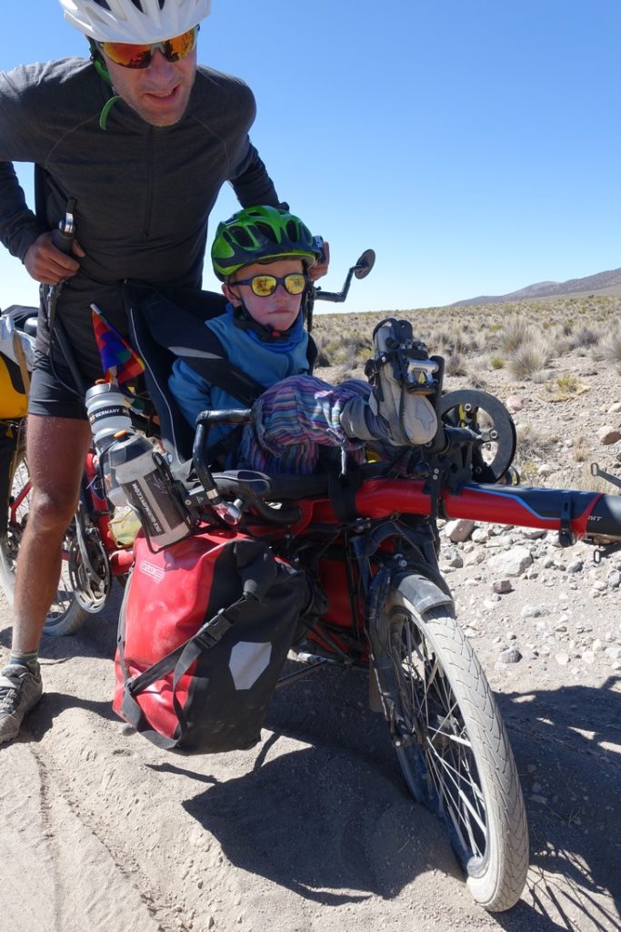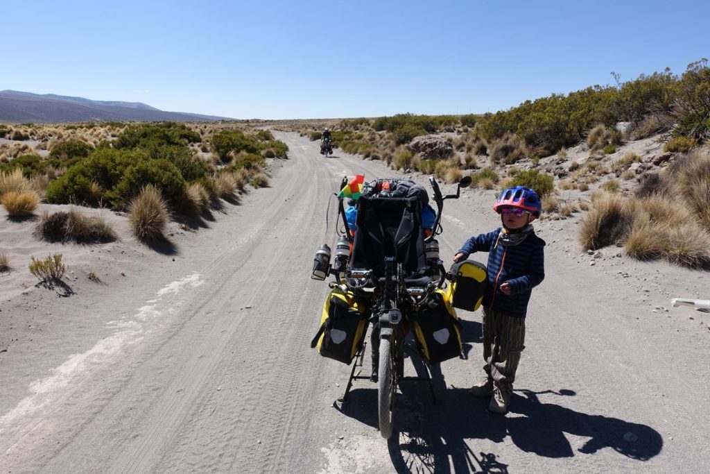 Les premiers kilomètres nous font déjà douter… La piste est très sableuse et régulièrement nous devons pousser, surtout que ça monte pour commencer. Rien à voir avec hier… Avancer est difficile. Les enfants ont beau pédaler de toutes leurs forces pour aider les parents, cela ne suffit pas à compenser l’étroitesse des pneus et le poids des vélos, qui finissent par s’échouer à chaque banc de sable. Nous avons une pensée pour lesPandasPédalent qui étaient passés par là avec une carriole. Malgré tout, nous sommes récompensés par les paysages et à aucun moment nous ne regrettons d’avoir pris cette piste.