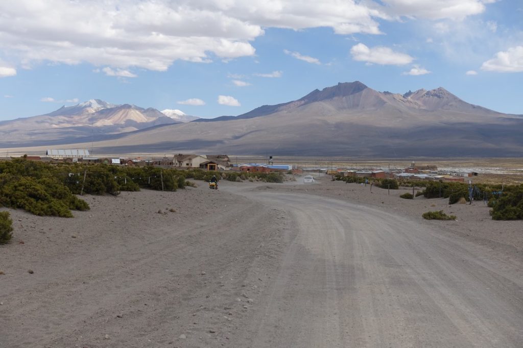 Quand nous repartons, nous nous faisons doubler par deux allemands à vélo. Ils sont allés aux bains et n’ont pas de chargement. Ils nous disent que Sajama n’est pas loin et effectivement, nous apercevons le village au loin. Pour une fois, les kilomètres sont vite avalés mais nous ne changeons pas d’avis.