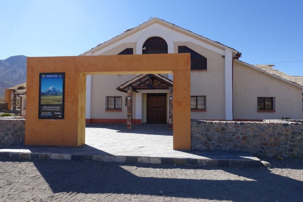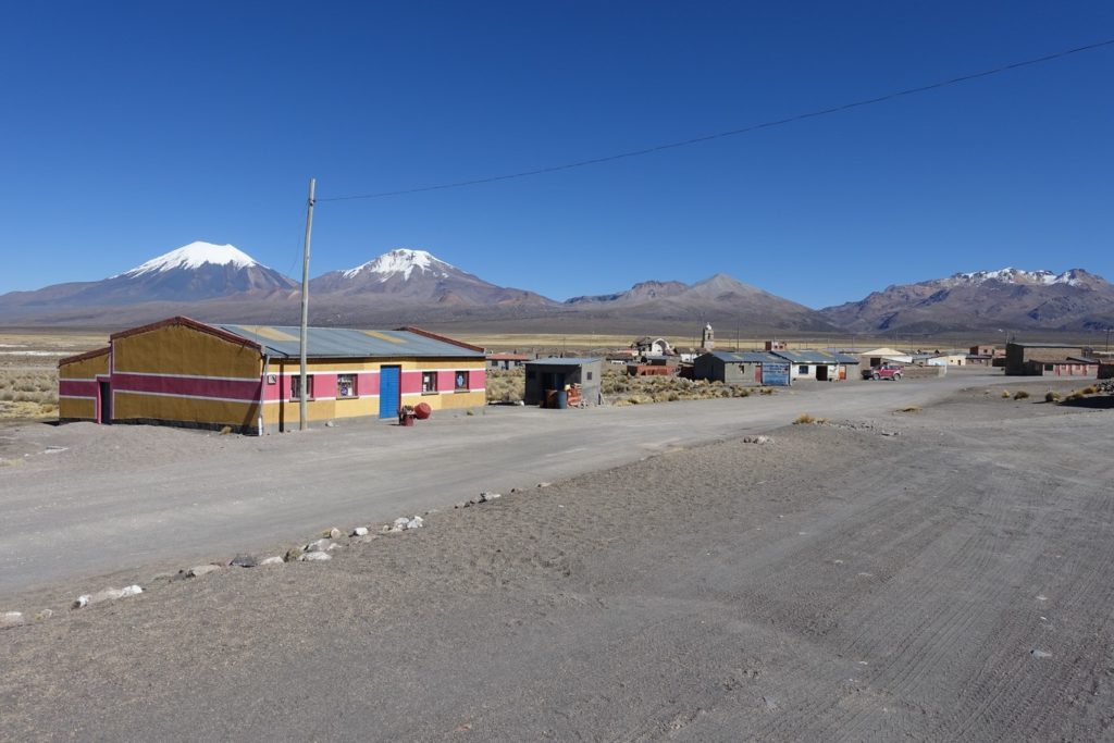 Vent de face, le soleil se cache derrière les montagnes. Il fait vite très froid. Nous rejoignons le lac. En passant sur le pont, nous voyons des flamants roses, ils sont magnifiques ! Nous nous arrêtons au poste de police. Ici aussi, impossible de dormir. Le policier nous dit qu’ils n’ont pas de place, n’ont pas les clés de tous les locaux abandonnés de l’ancien poste douanier, et qu’il ne faut pas camper, il va faire -20° cette nuit. Oui, d’accord mais qu’allons-nous faire du coup ? Il nous dit de descendre à Putre pour passer la nuit… Nous avons alors une idée, nous allons laisser les vélos ici et descendre à la ville. De toute façon, nous voulions y aller faire des courses demain. Nous nous empressons de nous changer et de prendre nos doudounes, le policier nous met la pression car un bus devrait arriver. Il nous invite à nous mettre au chaud et nous offre des bugnes bien chaudes et un stick à lèvres pour les enfants.