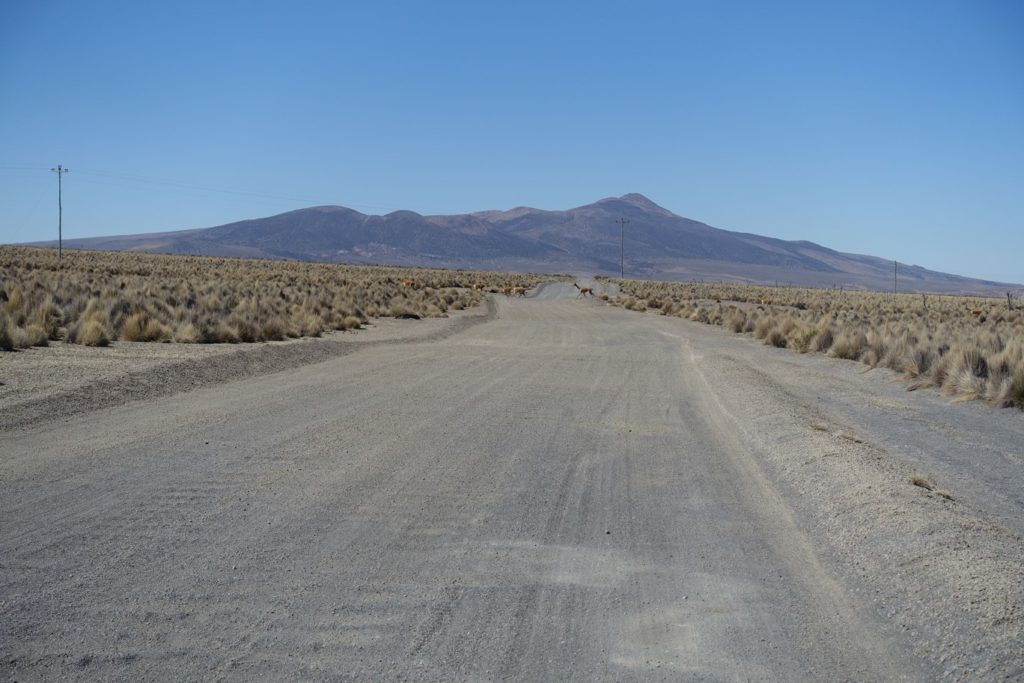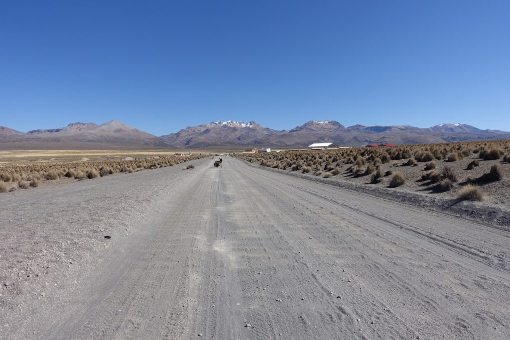 10 kilomètres avant d’atteindre Tambo Quemado, la route est une grande ligne droite. La ville paraît si proche et pourtant… Nous avançons bien, nous nous habituons de nouveau au défilé des camions. Enfin, voilà la station-service. Nous faisons remplir notre réserve sans aucun soucis et continuons vers la rue principale. Nous faisons le tour des tiendas pour trouver le taux de change le plus intéressant et échangeons 500 bolivianos pour obtenir 49 100 pesos chiliens !
