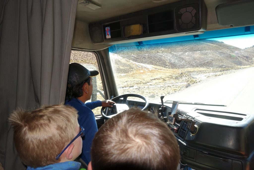 Nous discutons avec Johnny. Il nous offre un verre de coka quina. Nous nous prenons en photo. L’ambiance est bonne dans la cabine ! Nous voyons des vigognes et les paysages sont magnifiques.
