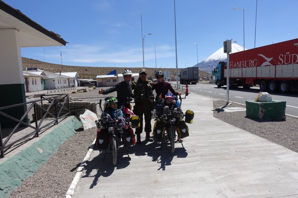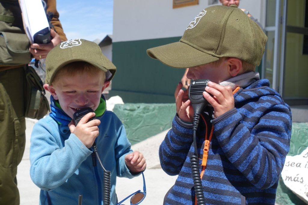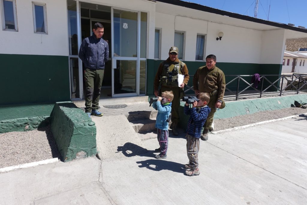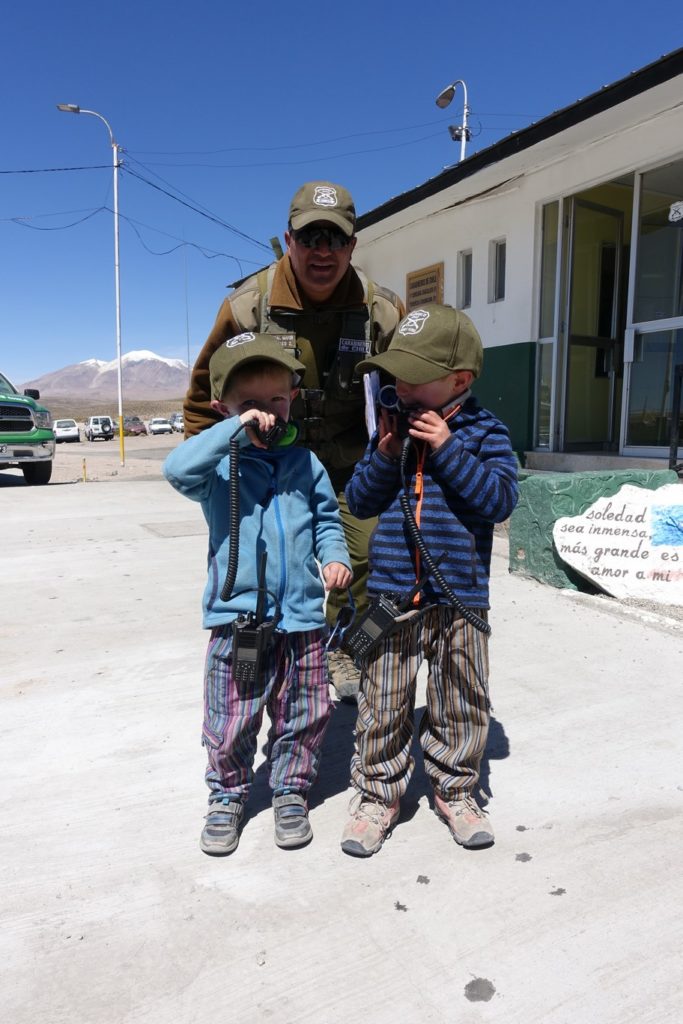 Diabolo et Satanas sont toujours là. Nous rejoignons les carabinieros, ils sont heureux de revoir Martin et Lucas. Ils prennent de nombreuses photos et appellent même leur famille, les enfants leur parlent au téléphone. Martin et Lucas essayent les jumelles et les radios. Pendant ce temps, les parents essayent de faire rentrer toutes les provisions dans les sacoches. Nous sommes vraiment chargés. De plus, les carabinieros nous ramènent des pommes, des biscuits et offrent du jus de fruit et des chocolats aux enfants. Ils nous gâtent ! Nous terminons de remplir la deuxième poche à eau avec l’une de leur bouteille.
