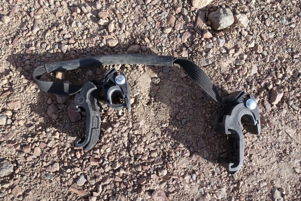 Tout est plus facile et nous allons plus vite ! Encore quelques passages sablonneux mais aisément passés, sauf un. Papa a pourtant bien freiné mais Satanas se plante dans le sable et c’est la chute. Pas de mal pour les passagers par contre une attache d’une sacoche est cassée ! Zut ! Normalement, nous avons la pièce de rechange au fond d’une des sacoches, rien de grave donc.