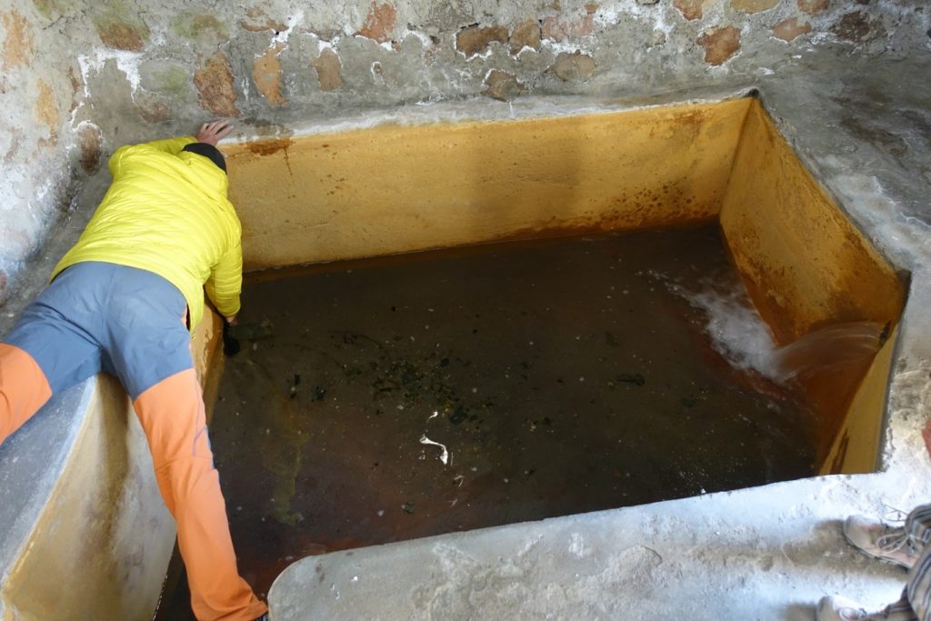 Heureusement, nous sommes arrivés à notre lieu de bivouac, les bains chauds de Chirigualla. Nous voyons la petite cabane et y entrons pour voir. L’eau chaude coule à peine, le bassin est vide. Nous sommes déçus. Il est déjà 16h00, nous allons nous occuper de monter la tente. Un peu plus loin, il y a un emplacement idéal dans un petit cirque. Nous devrions être plus ou moins abrités du vent.