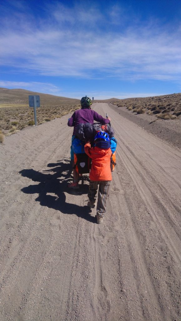 Après un repas rapide, nous repartons… en alternant des phases de pédalage et de poussée… Il reste encore 2,5 km de montée, le sable est toujours là. A un moment, Martin descend du vélo, Maman pousse. D’un coup, Diabolo va vite ! C’est Martin qui aide à pousser, sans rien lui avoir demandé. Impressionnant !