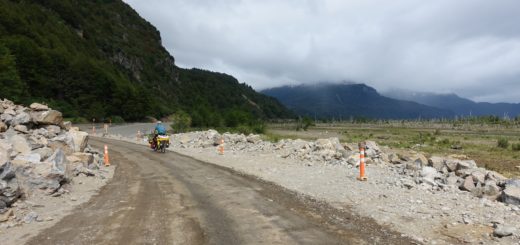A 13h30, nous avons presque fait 4 km. Nous faisons notre pause déjeuner. Le vent s’est levé. une camionnette passe, c’est un chilien qui tient un restaurant plus loin sur la piste. Nous y ferons peut-être une halte dans les prochains jours.