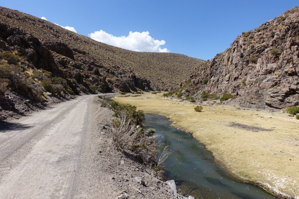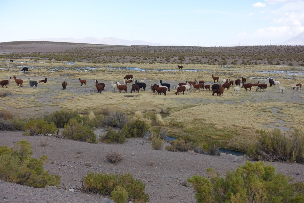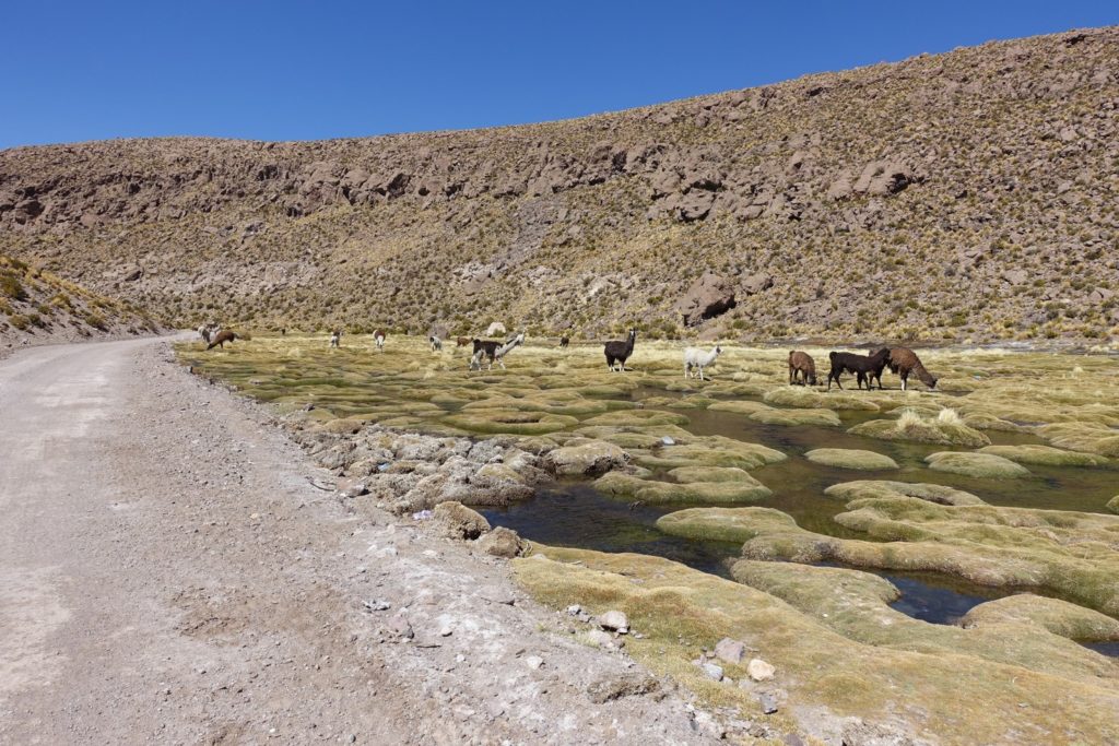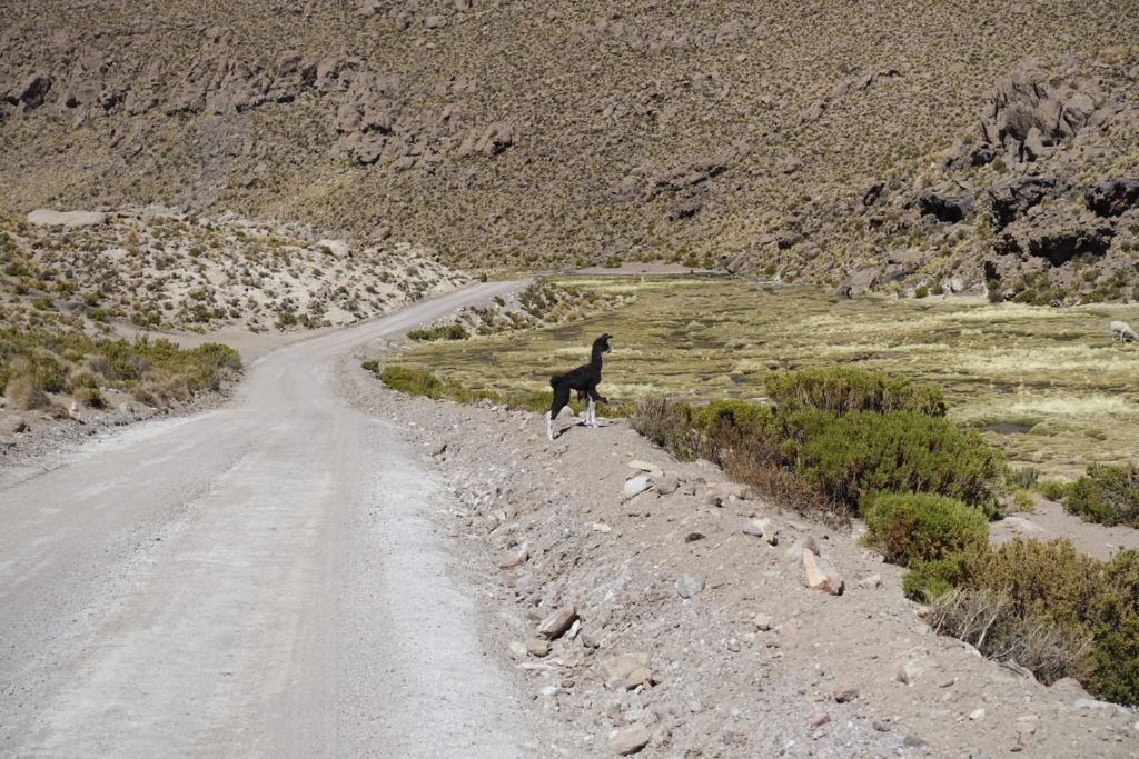 C’est parti pour la petite montée, beaucoup de tôle ondulée. Puis vient la première descente. Nous suivons un petit rio avec beaucoup d’alpagas. C’est paisible. La piste monte et descend, toujours de la tôle du coup nous n’allons pas très vite, surtout Papa, il préfère préserver le vélo alors que Maman laisse aller et prend de la vitesse. Il faut dire que Diabolo est beaucoup plus léger que Satanas !