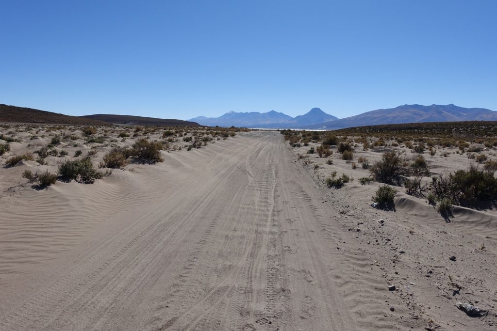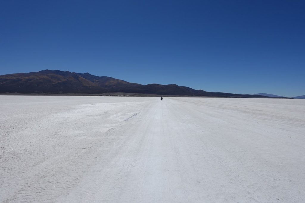 La piste sur le salar est bonne. Il y a des petites bosses et des trous d’eau, mais c’est assez plaisant dans l’ensemble.