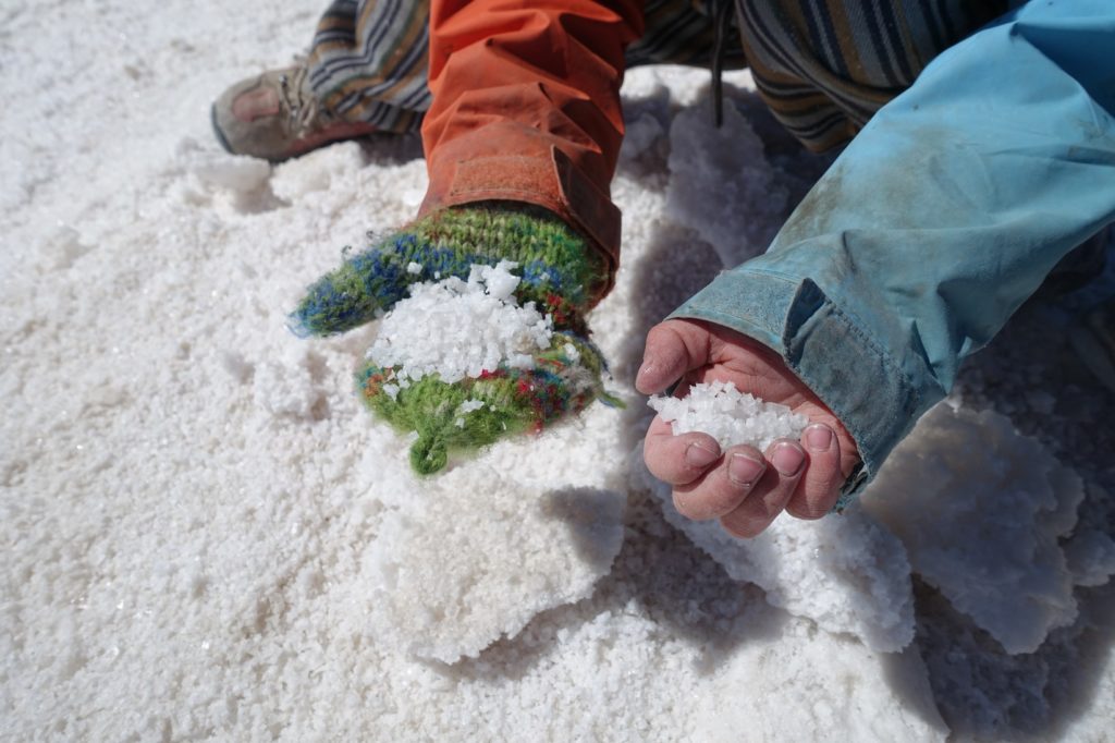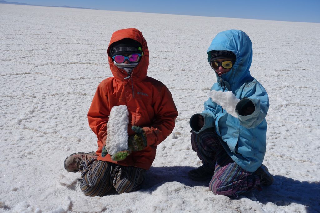 Nous prenons le petit-déjeuner dans la tente, malgré le soleil, il fait bien trop froid dehors. D’ailleurs, quand Papa met de l’eau dans des verres, elle gèle directement. Dès qu’il fait meilleur, les enfants sortent pour jouer dans le sel.