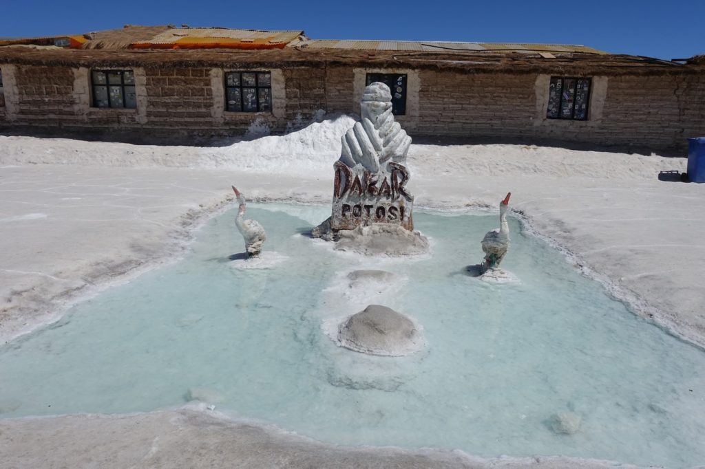 Nous sommes sur la bonne voie car nous arrivons à l’hôtel de sel. Ici aussi, il y a beaucoup de 4×4. Nous rentrons, tous les touristes sont en train de manger. Déception pour nous, il n’y a rien en vente mises à part quelques boissons. Tous les groupes arrivent avec leur nourriture. Spectacle dur pour nous, nous n’avons plus grand chose à grignoter et eux mangent du pain, du poulet, des salades… Nous prenons à boire et ne traînons pas à l’intérieur. En partant, des guides offrent des sucettes aux enfants. Ils sont aux anges !