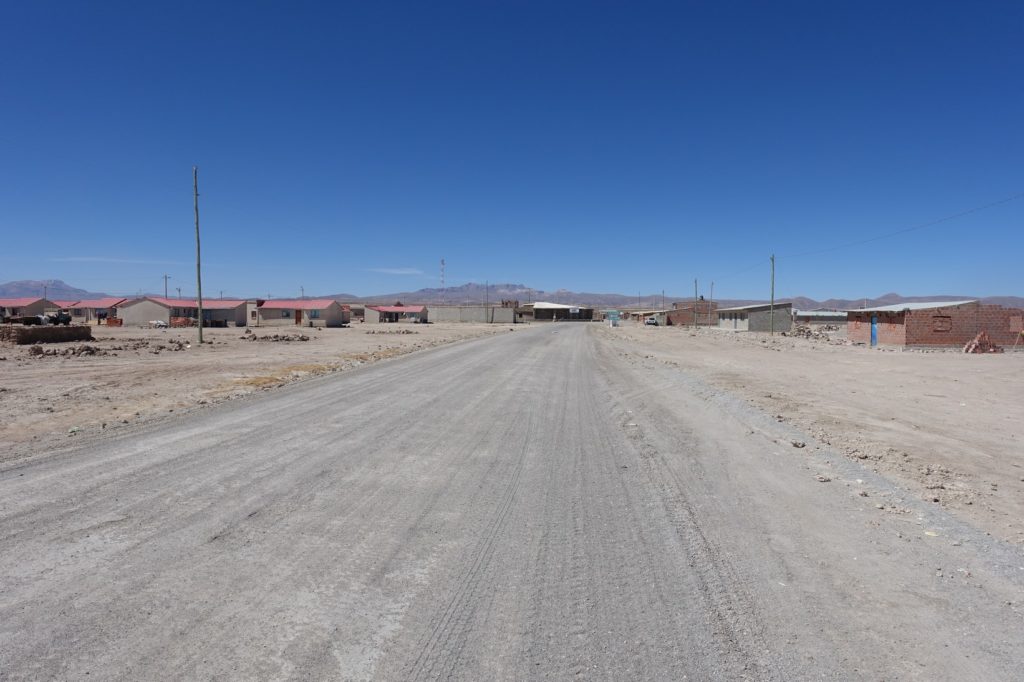 Nous repartons en direction de Colchani. Nous voyons des grands bâtiments, la ville semble proche et pourtant, nous avons encore une dizaine de kilomètres à parcourir. Nous choisissons une piste ne sachant pas trop si c’est la bonne. Nous ne regardons pas le GPS pendant un petit moment. Au final, nous faisons un petit détour mais rien de bien grave. La ville est plus loin que prévu, ce sont des hôtels au bord du salar que nous avions aperçus ! Nous trouvons un passage qui la rejoint et quittons le salar. C’est une page de notre voyage qui se tourne !