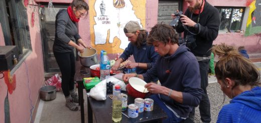 Nous allons immortaliser notre passage devant la forêt aux drapeaux et voyons passer un petit camion, ce sont les suisses, Lars et Karin ! Ils ont passé trois nuits dans le salar et vont maintenant à Uyuni. Ils nous font goûter du pain qu’ils ont fait à la poêle, c’est un régal pour nos papilles ! Peut-être les reverrons nous en ville ou à Sucre.