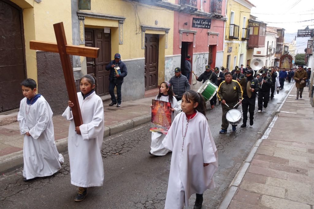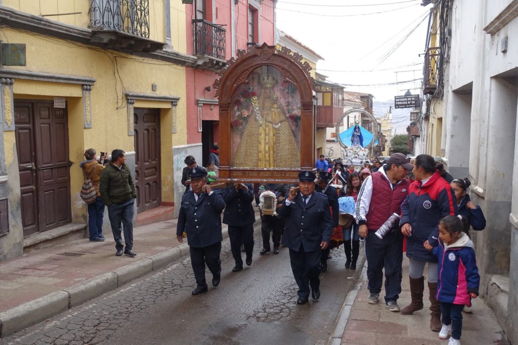 C’est l’heure de déjeuner. Nous avons repéré un petit restaurant qui fait des salteñas. Il y a la queue. Pendant que nous attendons, une procession défile pour fêter la Sainte-Vierge de Guadalupe. Ce sont les policiers qui composent la fanfare. Nous n’avons pas de chance, une personne avant nous, le restaurant annonce qu’il n’y a plus rien à manger !