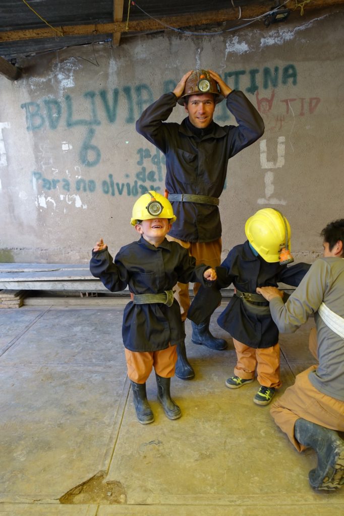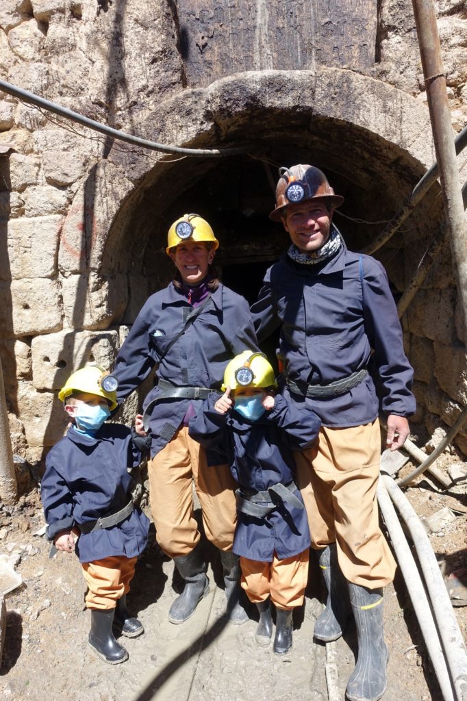 Nous allons à l’agence pour 9h00, nous sommes tout excités d’aller visiter les mines. L’autre famille francophone arrive, ils sont suisses : Pierre, Vanessa, Jeanne et Louise. Ils voyagent en camion depuis déjà 22 mois ! Nous commençons par aller nous équiper. Ils nous prêtent des casques, des vestes, des pantalons et des bottes. Ils n’en ont pas à la bonne taille pour les enfants, ça commence au 32. Nous en prenons quand même une paire pour Martin. Et leur casque sont un peu trop grand…